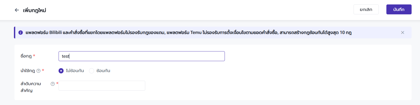 ซ้อนกัน: สำหรับกฎประเภทนี้ คำสั่งซื้อสามารถเข้ากฎหลายรายการพร้อมกันได้ ผู้ใช้งานสามารถสร้างกฎแบบซ้อนกันได้ไม่เกิน 10 กฎ