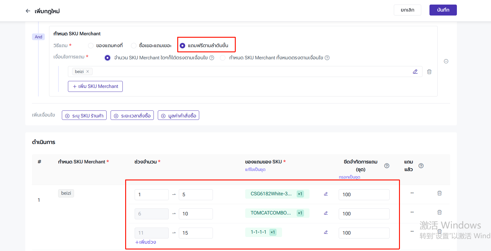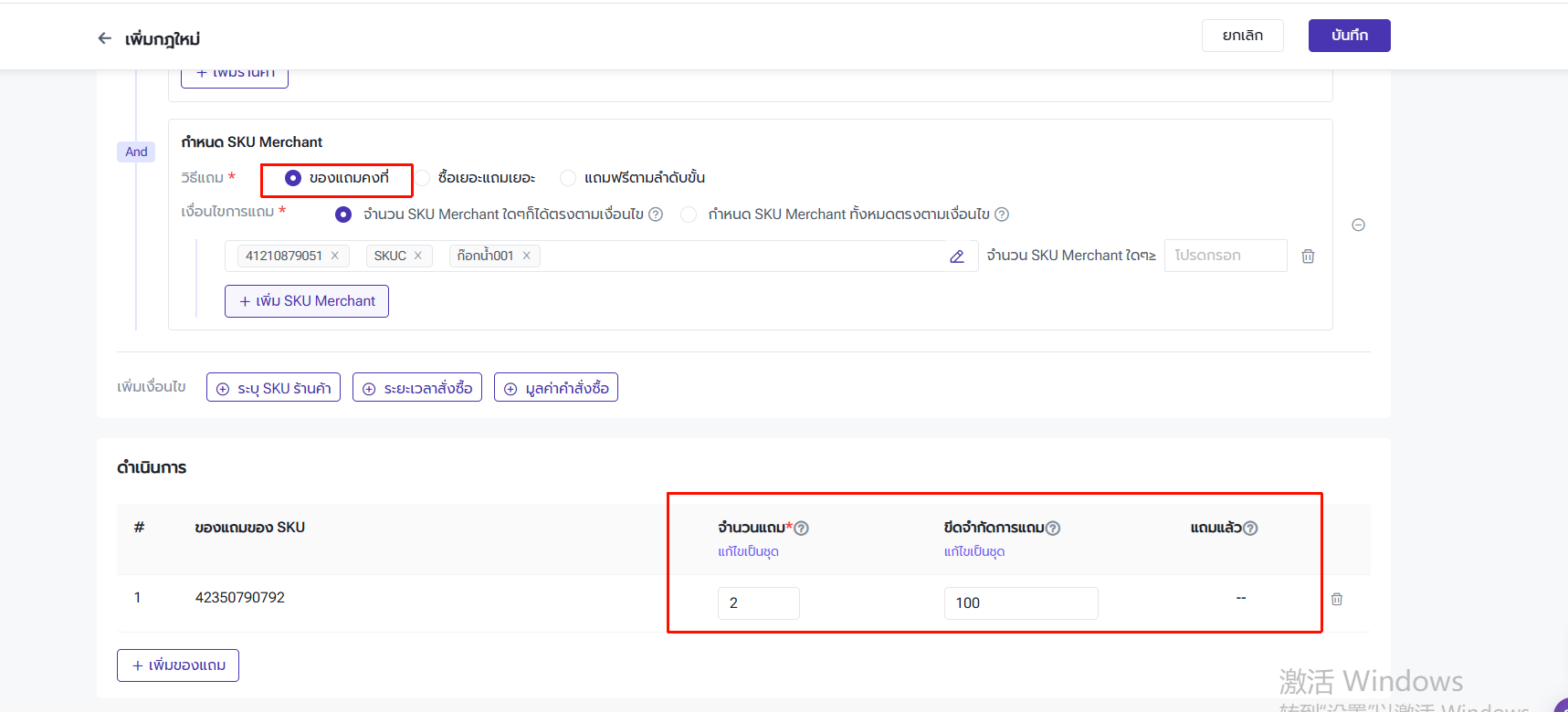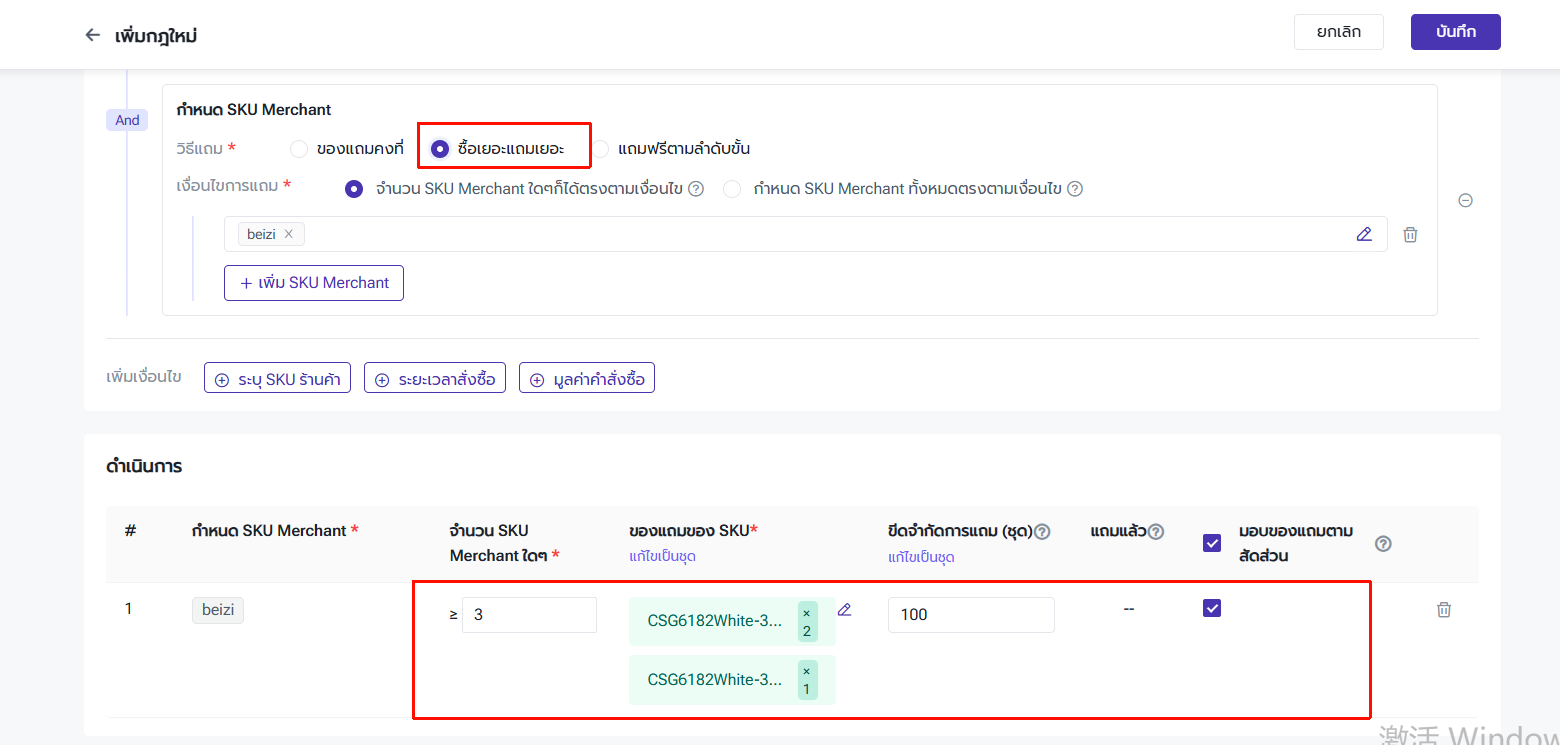 ผู้ใช้งานสามารถตั้งค่าจำนวน SKU ของเงื่อนไข ของแถม และขีดจำกัดการแถม พร้อมเปิดการตั้งค่า "มอบของแถมตามสัดส่วน"