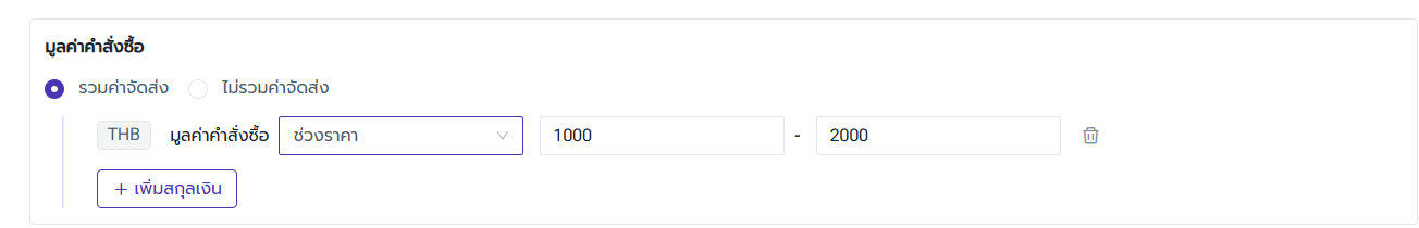 ผู้ใช้งานสามารถเลือกว่าจะรวมค่าจัดส่งในมูลค่าคำสั่งซื้อหรือไม่ แล้วกด "เพิ่มสกุลเงิน" โดยสามารถเลือกวิธีการคำนวณ "≥" "≤" "=" และ "ช่วงราคา"