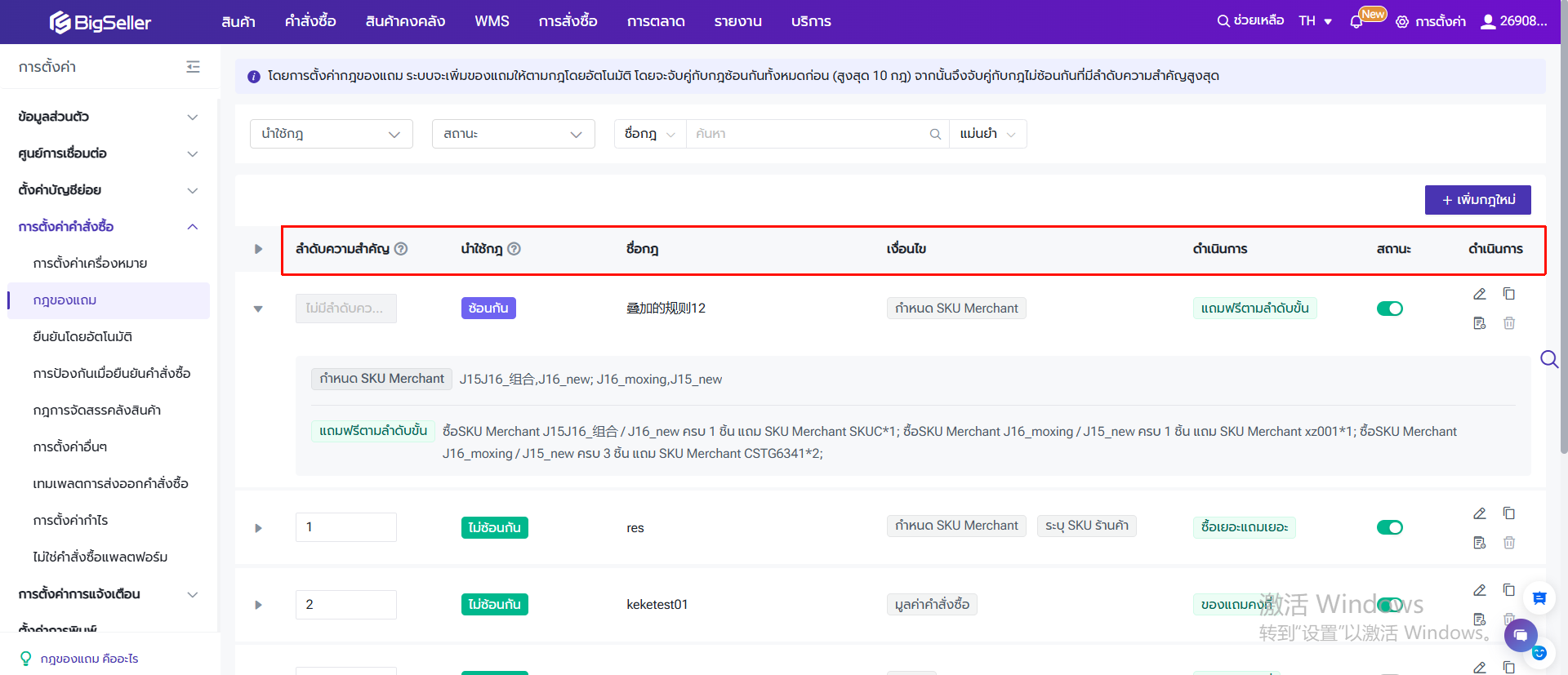 หลังจากบันทึกกฎของแถมเรียบร้อยแล้ว ผู้ใช้งานสามารถตรวจสอบรายละเอียด ตั้งค่าสถานะ และแก้ไขลำดับความสำคัญในรายการกฎของแถมได้