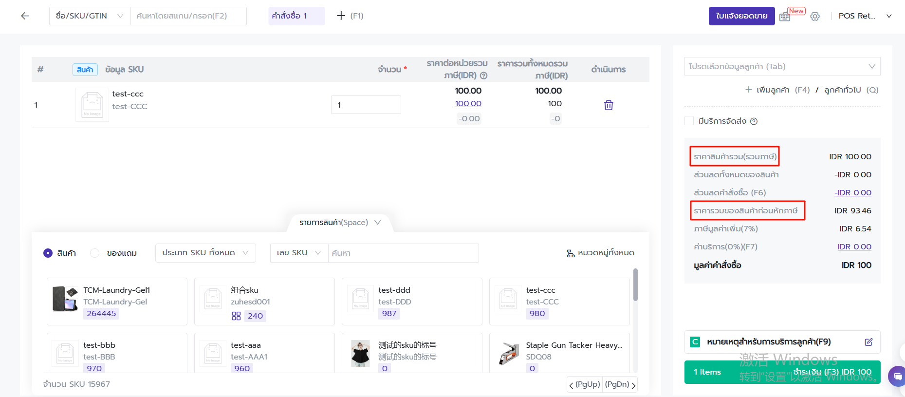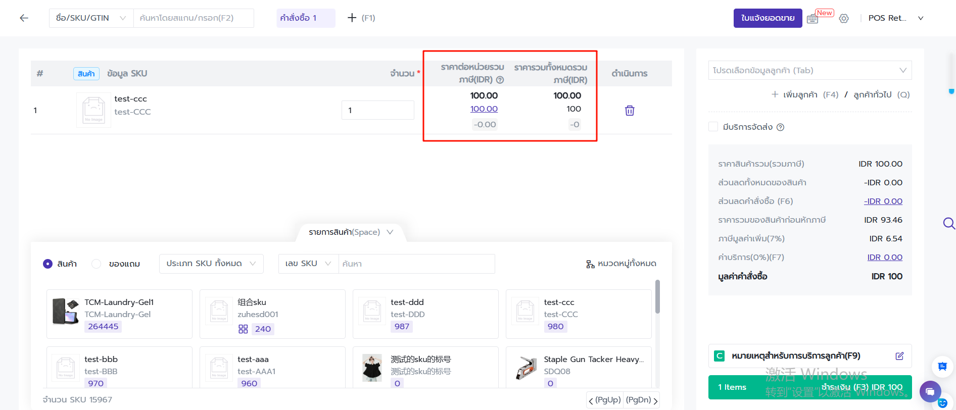 หลังจากเปิดใช้งาน "ราคาสินค้ารวมภาษี" แล้ว ระบบจะแสดงข้อมูล "าคาต่อหน่วยรวมภาษี" และ "ราคารวมทั้งหมดรวมภาษี" ในข้อมูล SKU