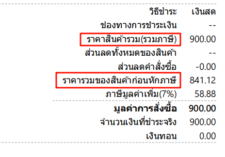 ในรายละเอียดราคาของคำสั่งซื้อ ระบบจะแสดงข้อมูล "ราคาสินค้ารวม(รวมภาษี)" และ "ราคารวมของสินค้าก่อนหักภาษี"