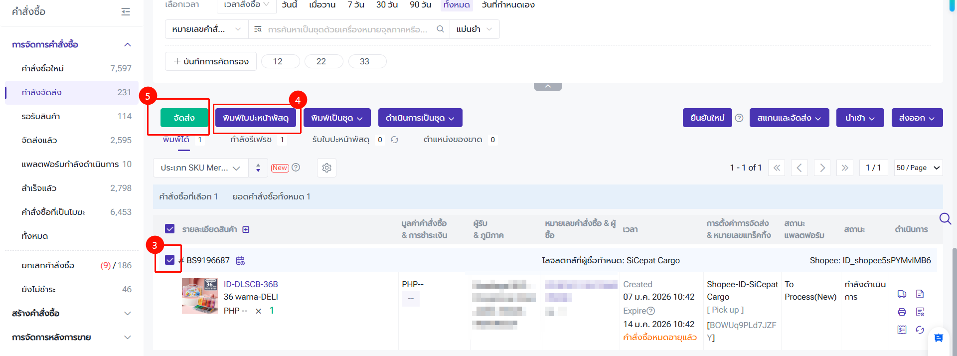 เลือกคำสั่งซื้อ > พิมพ์ใบปะหน้าพัสดุ > ดำเนินการจัดส่ง