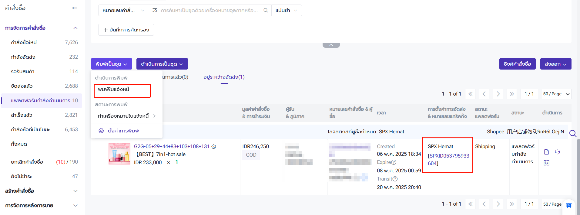 หลังจากมีข้อมูลในระบบของบริการขนส่งแล้ว ระบบ BigSeller จะย้ายคำสั่งซื้อไปยังเมนู "แพลตฟอร์มกำลังดำเนินการ" > "คำสั่งซื้อที่จองไว้"