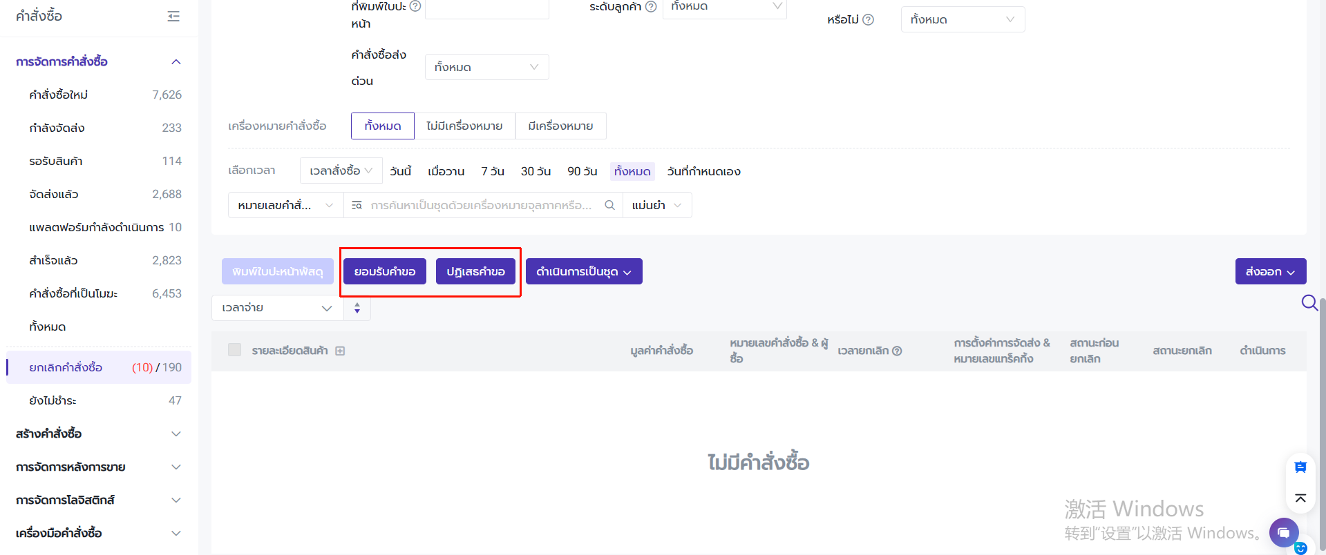 ผู้ใช้งานสามารถดำเนินการยอมรับหรือปฏิเสธคำขอยกเลิกคำสั่งซื้อแบบ "Matched Orders" เท่านั้น