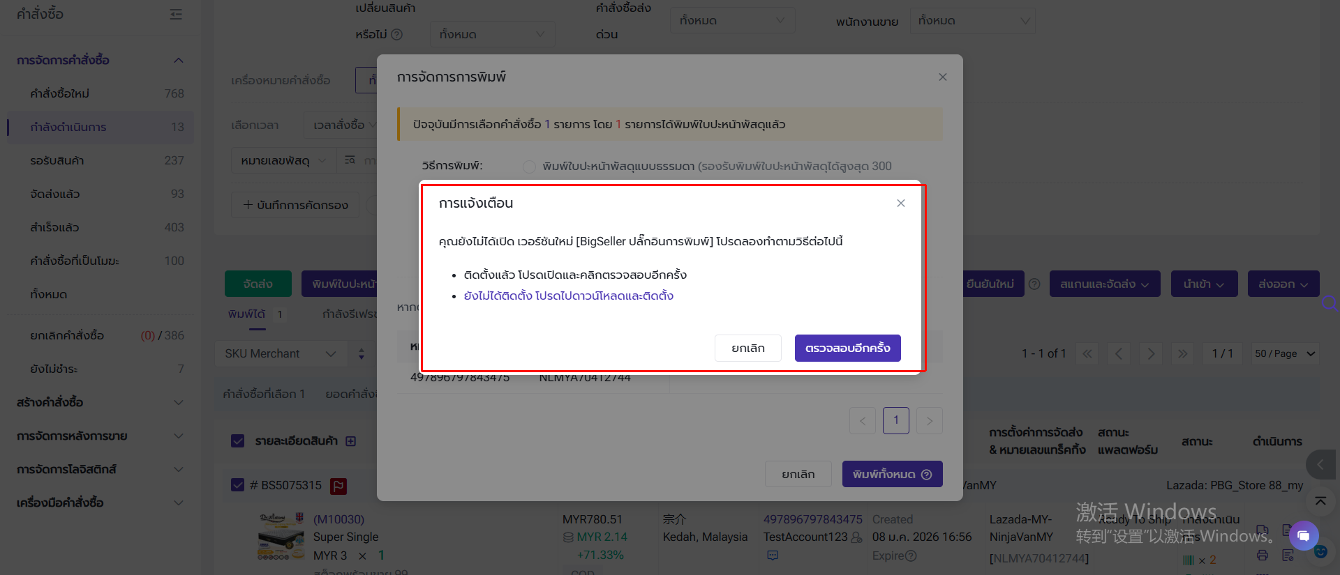 เปิดคิวงานพิมพ์ของเครื่องพิมพ์เพื่อตรวจสอบว่ามีงานพิมพ์อยู่หรือไม่ หากไม่มีงานพิมพ์ ผู้ใช้งานสามารถตรวจสอบว่าการพิมพ์ล้มเหลวหรือไม่ และยังสามารถอัปโหลดบันทึกการพิมพ์ก่อน แล้วแจ้งให้บริการหลังการขายของ BigSeller ช่วยตรวจสอบสาเหตุของปัญหา