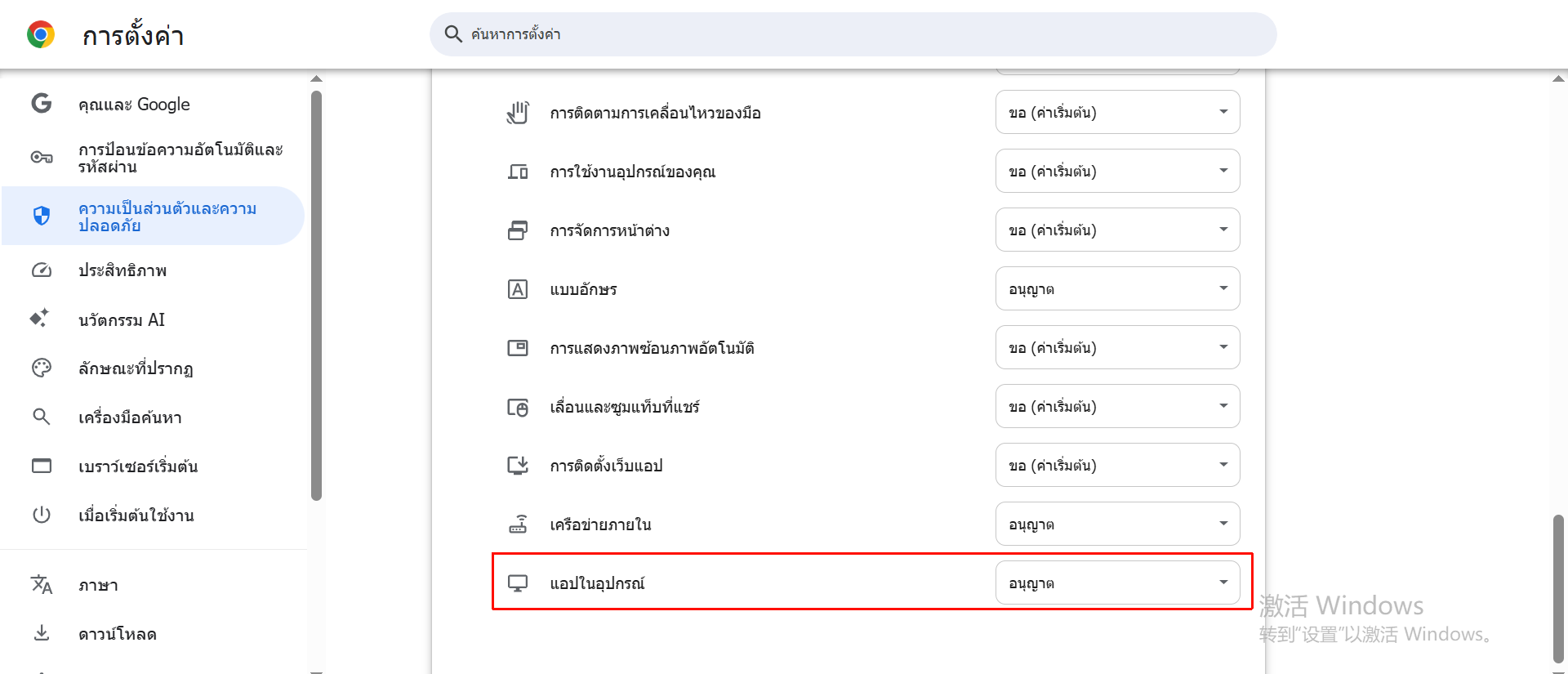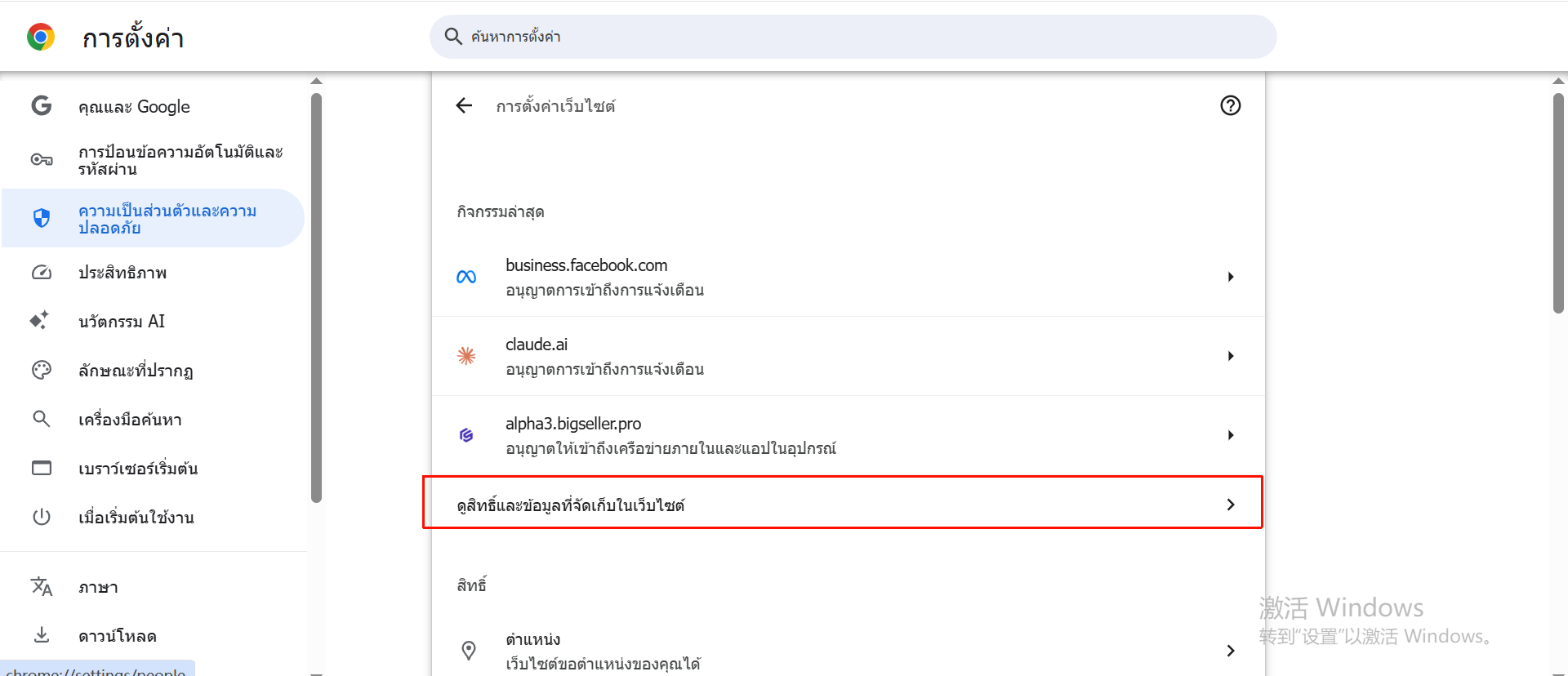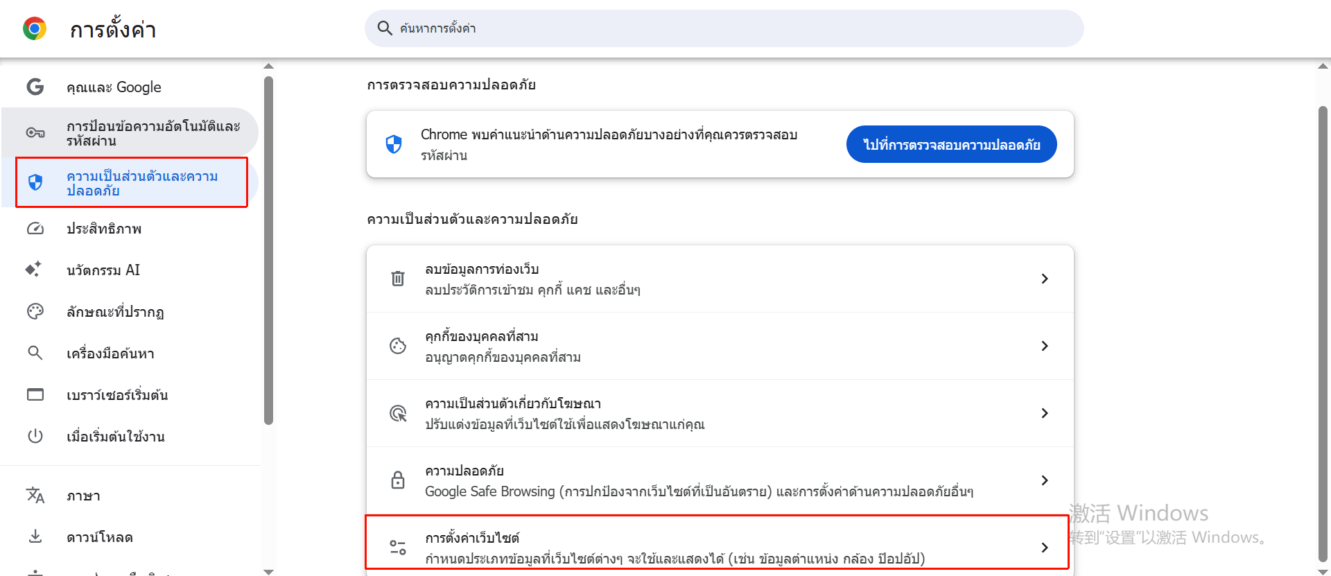 > ความเป็นส่วนตัวและความปลอดภัย > การตั้งค่าเว็บไซต์