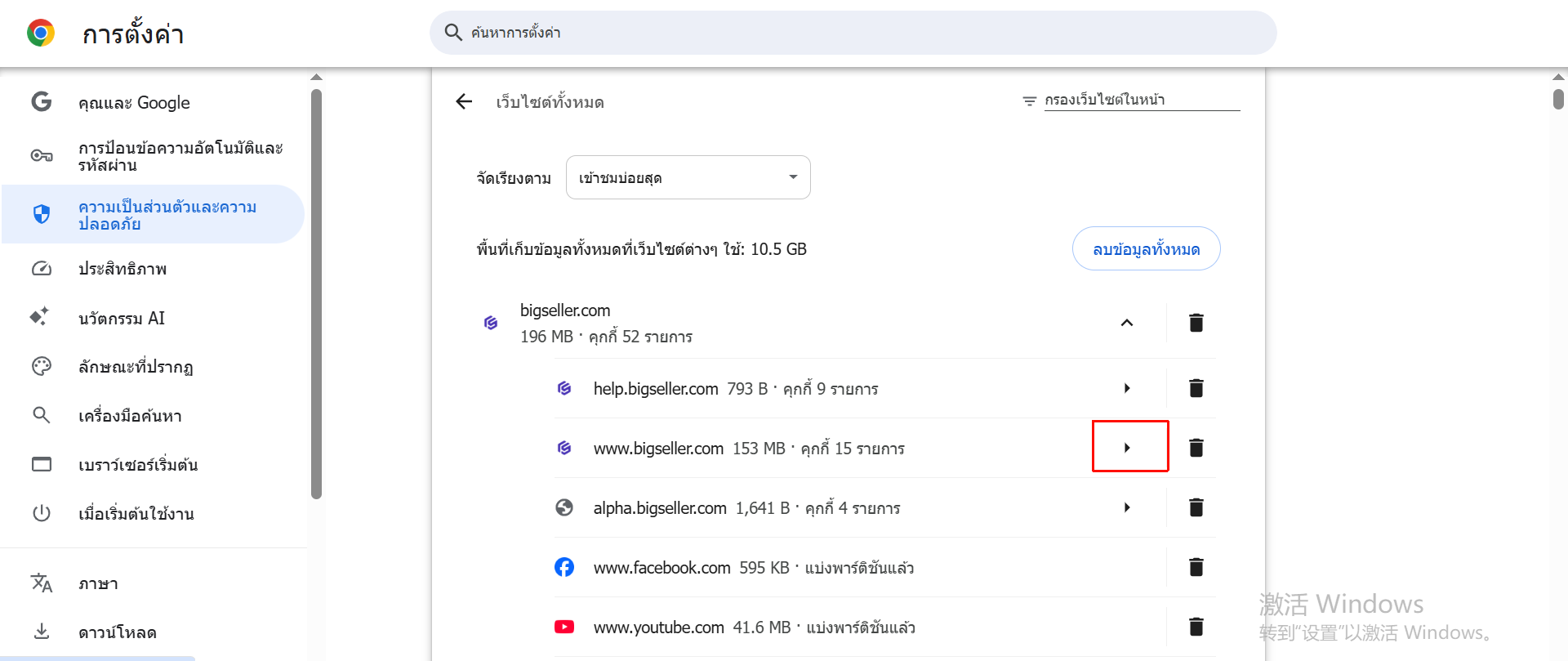 > ค้นหา www.bigseller.com / www.bigseller.pro (หากไม่พบ ปกติจะถูกพับไว้ใน “ดูสิทธิ์และข้อมูลที่จัดเก็บในเว็บไซต์” สามารถกดขยายได้)