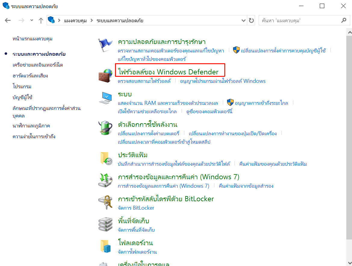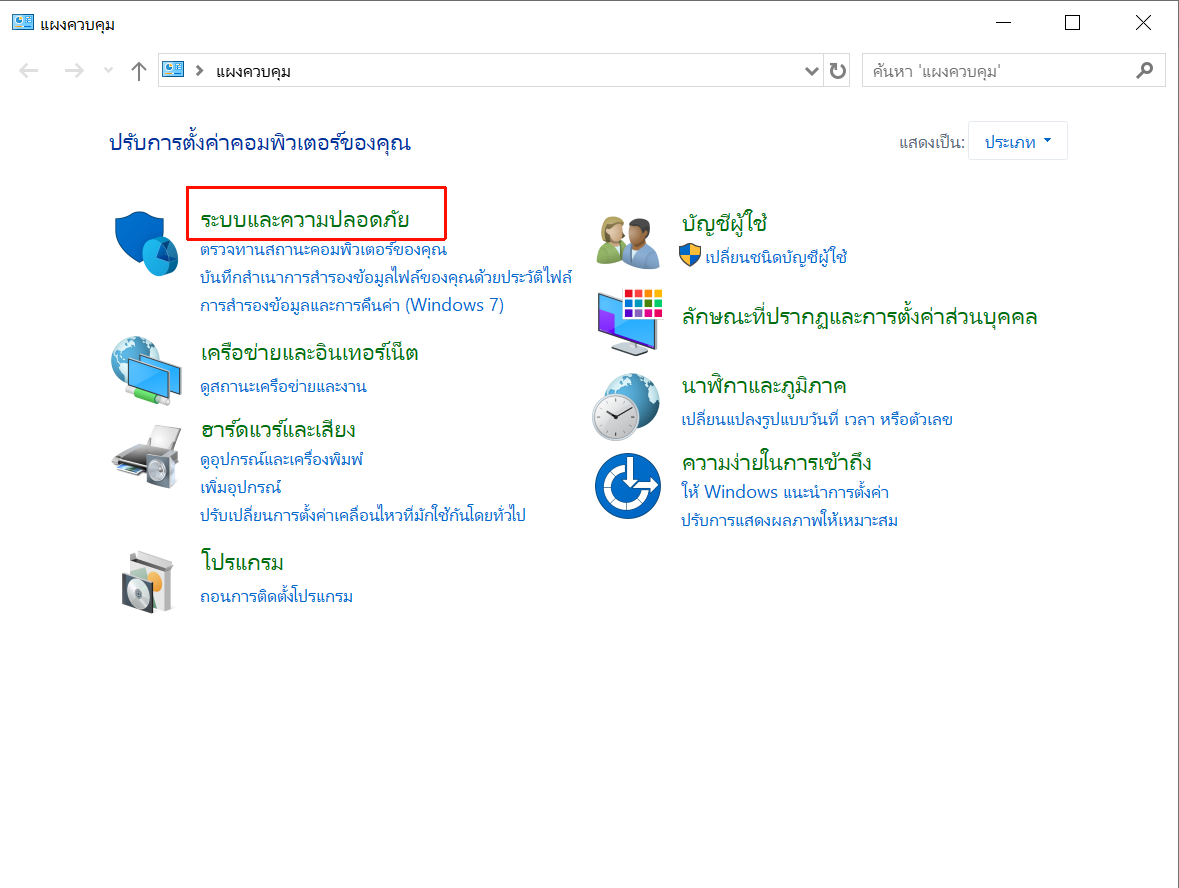 ก่อนอื่น เปิดแผงควบคุมจากเมนูการตั้งค่าระบบของคอมพิวเตอร์ จากนั้นเลือก "ระบบและความปลอดภัย"