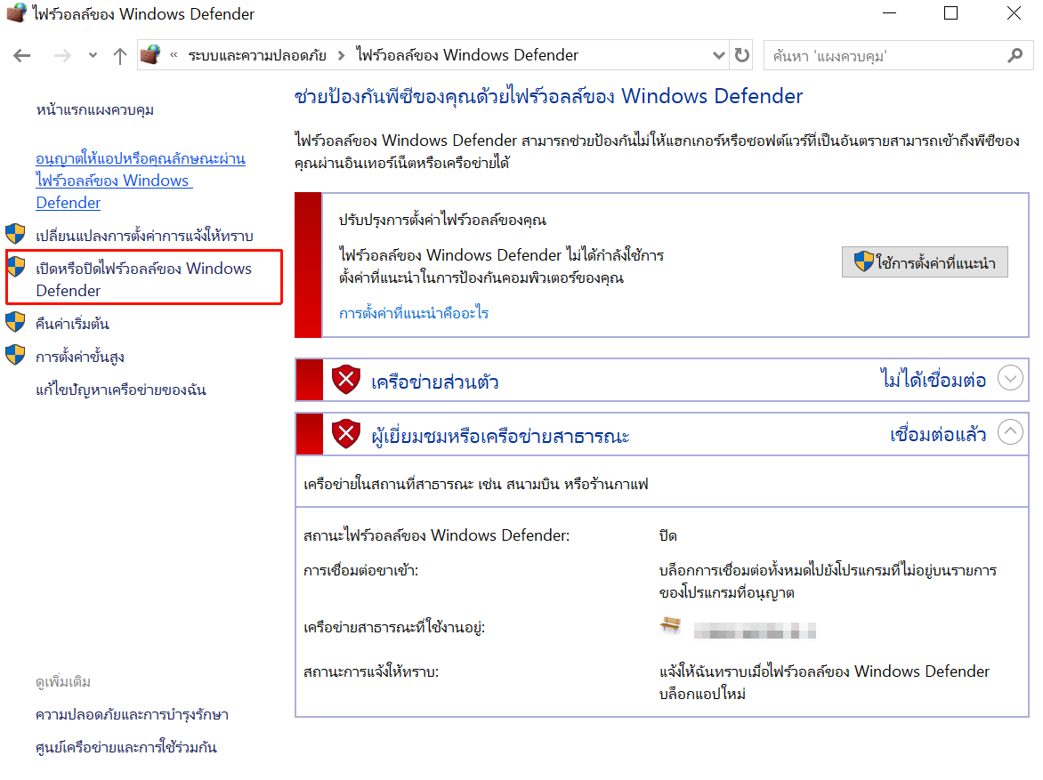 คลิก "เปิดหรือปิดไฟร์วอลล์ของ Windows Defender"