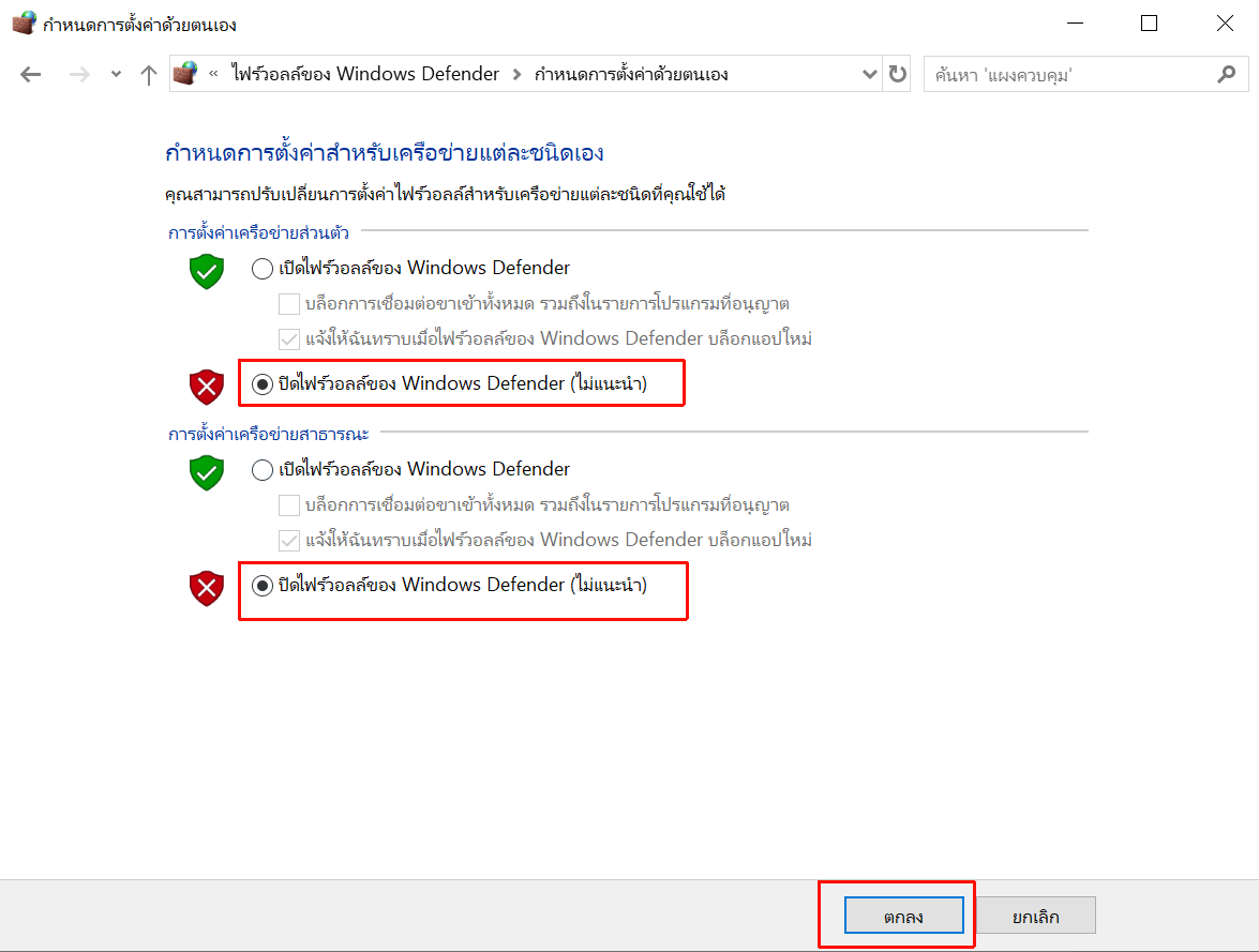 จากนั้นเลือก "ปิดไฟร์วอลล์ของ Windows Defender" แล้วคลิก "ตกลง" เพื่อบันทึกการเปลี่ยนแปลง