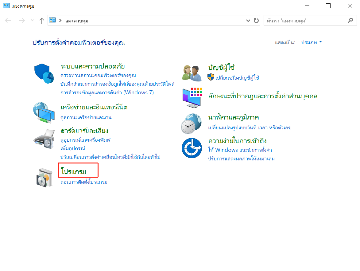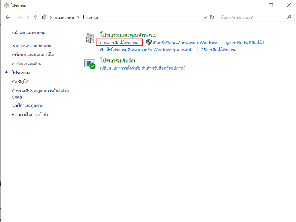 > โปรแกรมและคุณลักษณะ > ถอนการติดตั้งโปรแกรม