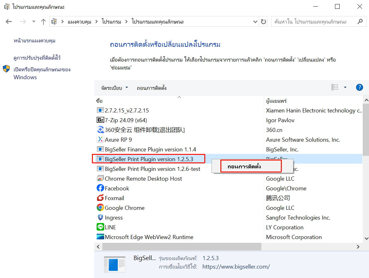 > คลิกขวาเพื่อถอนการติดตั้ง BigSeller Print Plugin แล้วติดตั้งปลั๊กอินใหม่อีกครั้ง