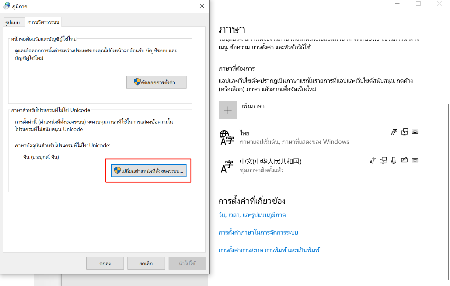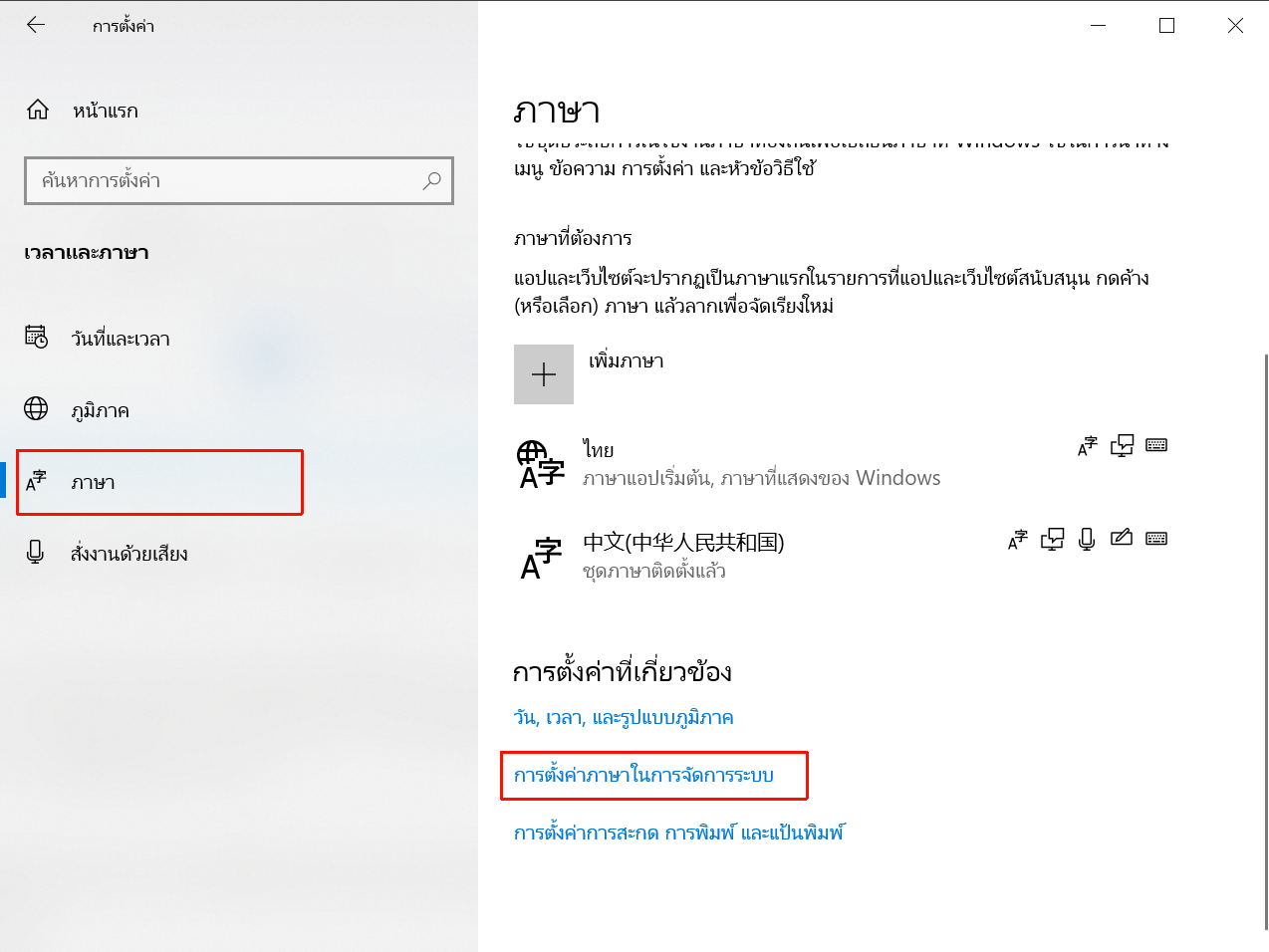 ไปยังการตั้งค่าระบบคอมพิวเตอร์ > เวลาและภาษา > ภาษา > การตั้งค่าภาษาในการจัดการระบบ