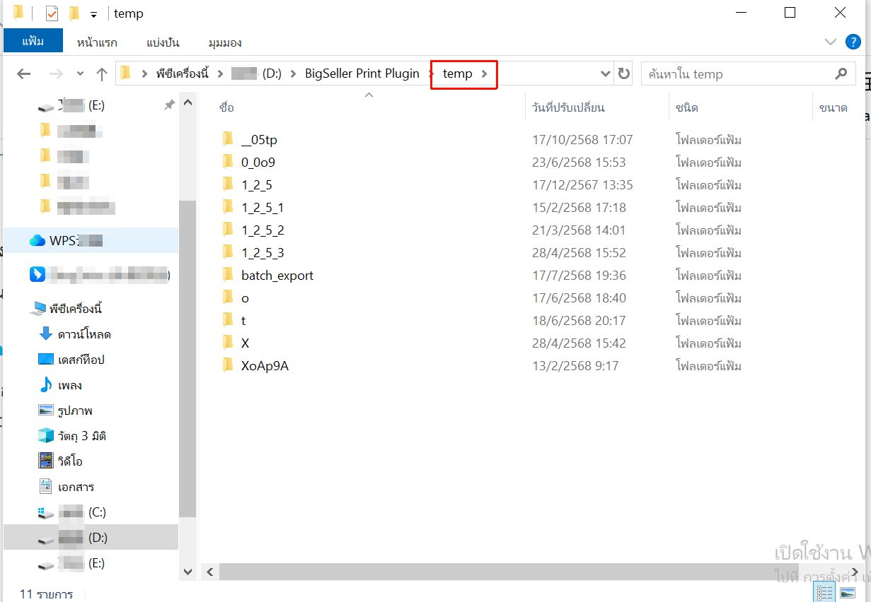 เปิดโฟลเดอร์ติดตั้งปลั๊กอิน แล้วหาโฟลเดอร์ temp เช่น D:\BigSeller Print Plugin\temp จากนั้นลบไฟล์ทั้งหมดภายในโฟลเดอร์ temp (สามารถพิจารณาตามความเป็นจริงว่าจำเป็นต้องลบทั้งหมดหรือไม่)