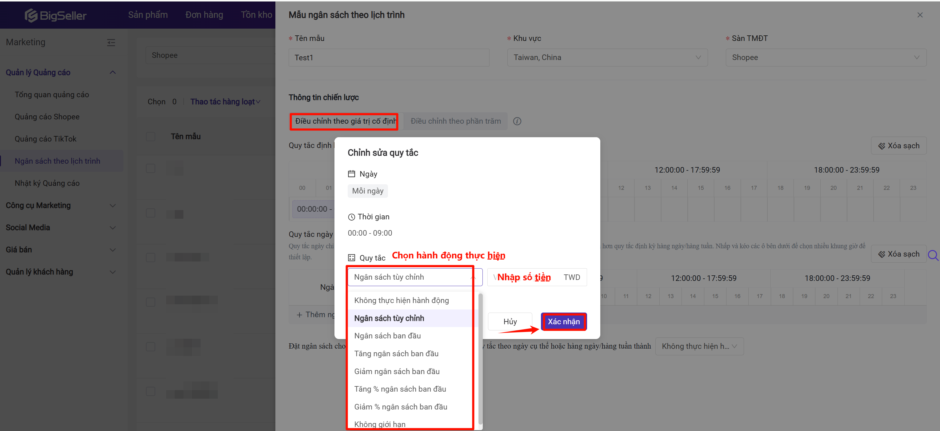 ②Ngân sách tùy chỉnh: Dựa theo số tiền bạn thiết lập, hệ thống sẽ thay đổi ngân sách quảng cáo trong khung thời gian tương ứng.