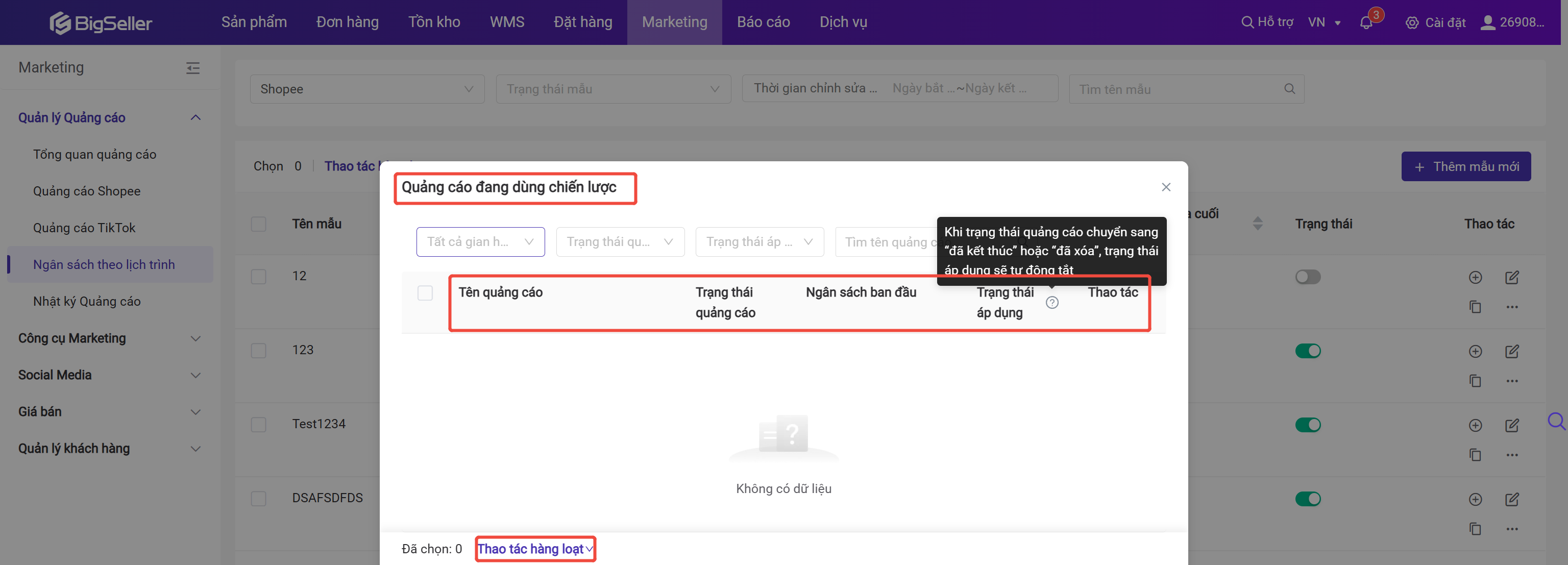 Quảng cáo đang dùng chiến lược: Nhấp vào đây để hiển thị tên quảng cáo, trạng thái quảng cáo, ngân sách ban đầu, trạng thái áp dụng của các quảng cáo đã được thêm vào chiến lược; có thể xóa quảng cáo nếu cần.