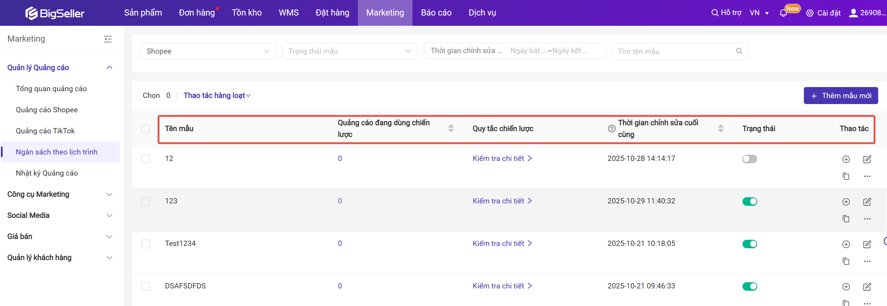 Vào trang Marketing → chọn “Ngân sách theo lịch trình” → Thêm mẫu mới