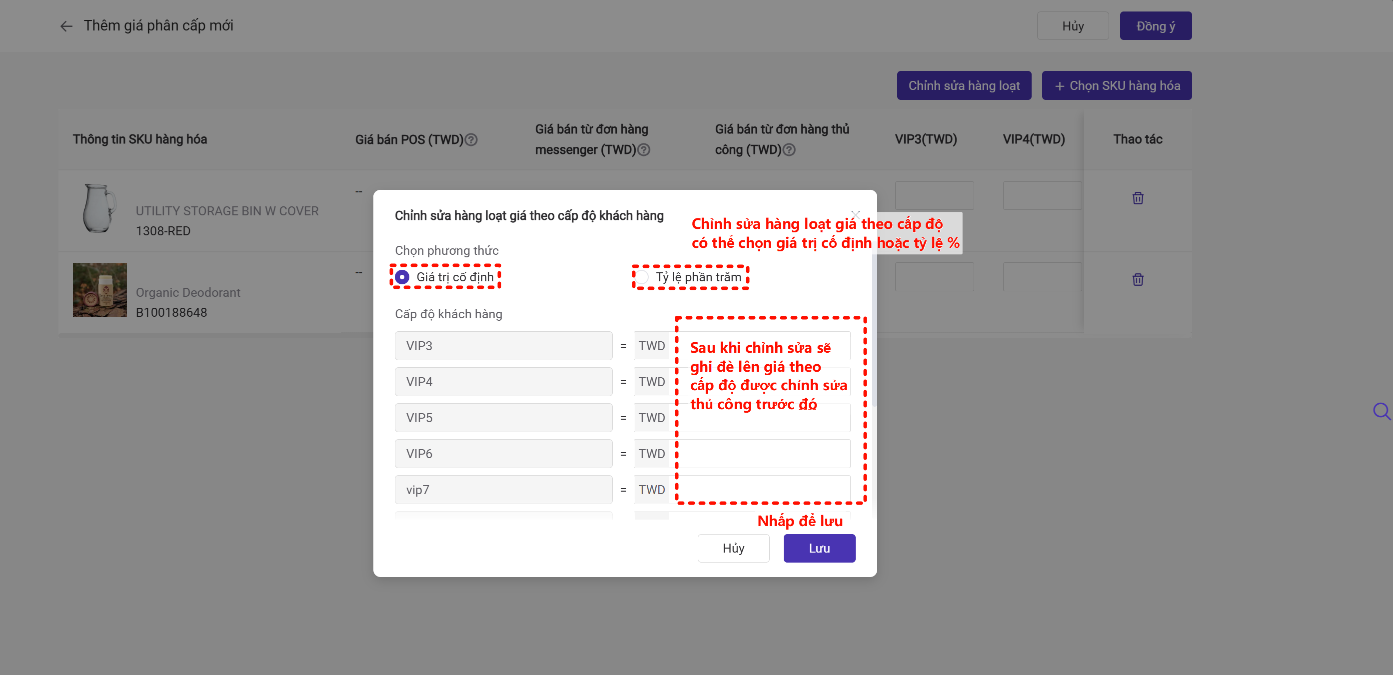 Bước 3: Nhập giá theo từng cấp độ khách hàng > Nhấn Đồng ý