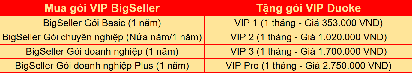 1. Trong thời gian diễn ra chương trình, nạp tiền để mua dịch vụ VIP của BigSeller, sẽ được tặng cấp VIP Duoke tương đương:
