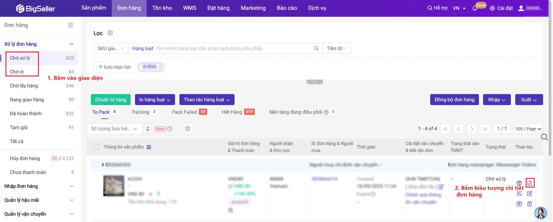 Bước 1: Bấm vào mô-đun đơn hàng> Vào mục【Chờ xử lý】hoặc【Chờ in】> Tìm kiếm đơn muốn sửa> Bấm biểu tượng chi tiết đơn hàng