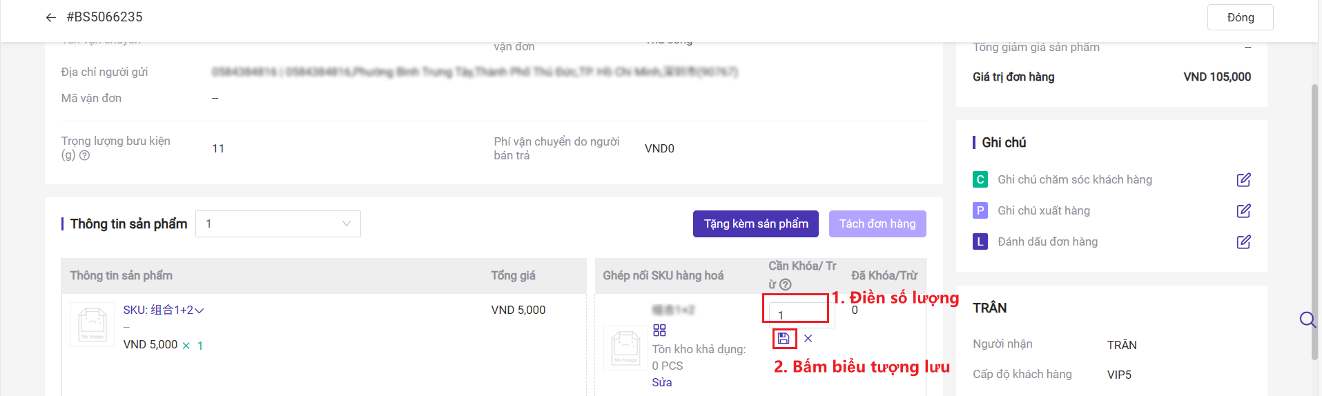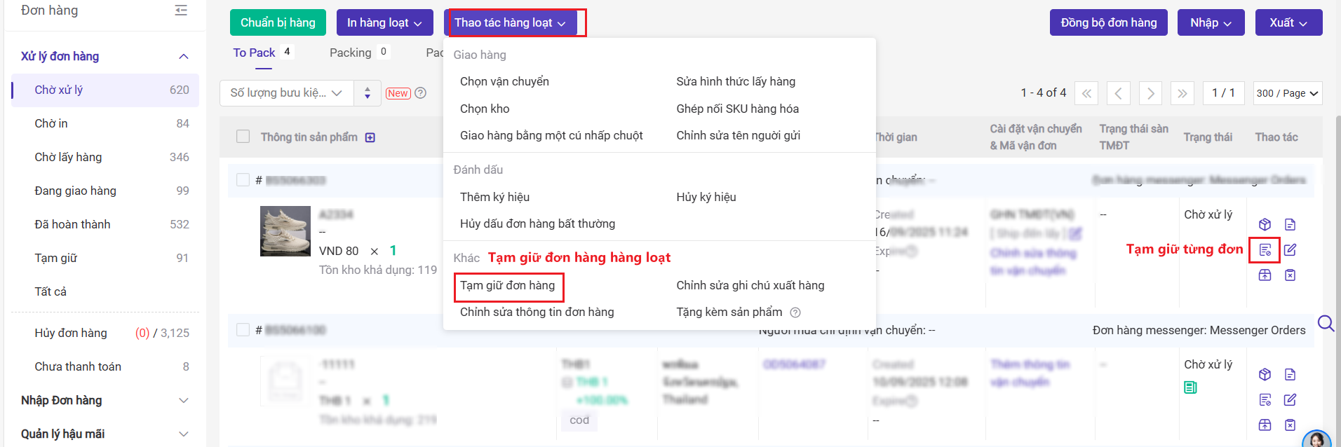 Khi đơn hàng ở mục 【Chờ xử lý】hoặc ở mục 【Chờ in/ Wave Picking】bạn có thể tạm giữ đơn rồi sửa lại số lượng tồn kho cần khóa/Trừ.