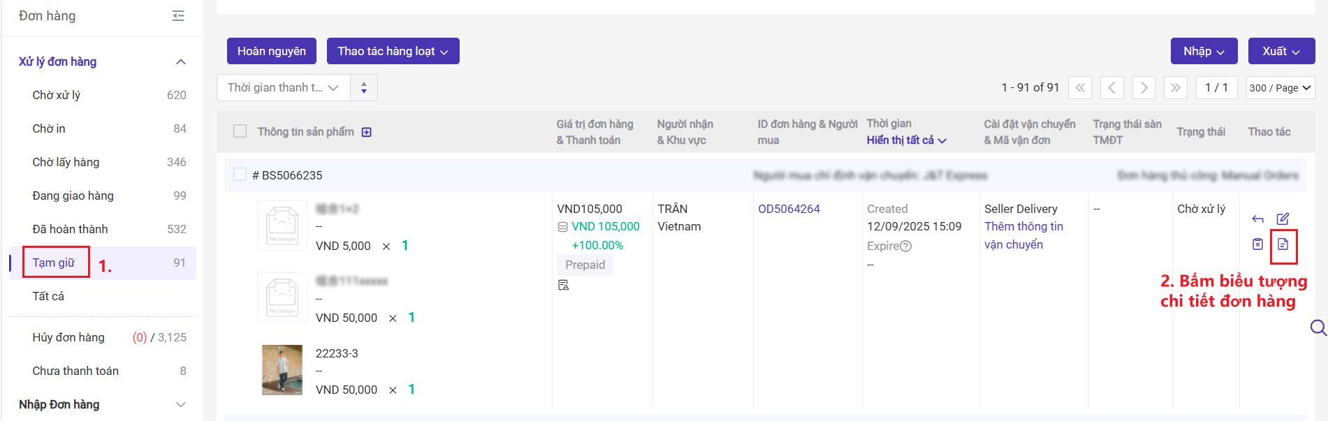 Bước 1: Vào mục【Tạm giữ】> Tìm kiếm đơn muốn sửa> Bấm biểu tượng chi tiết đơn hàng