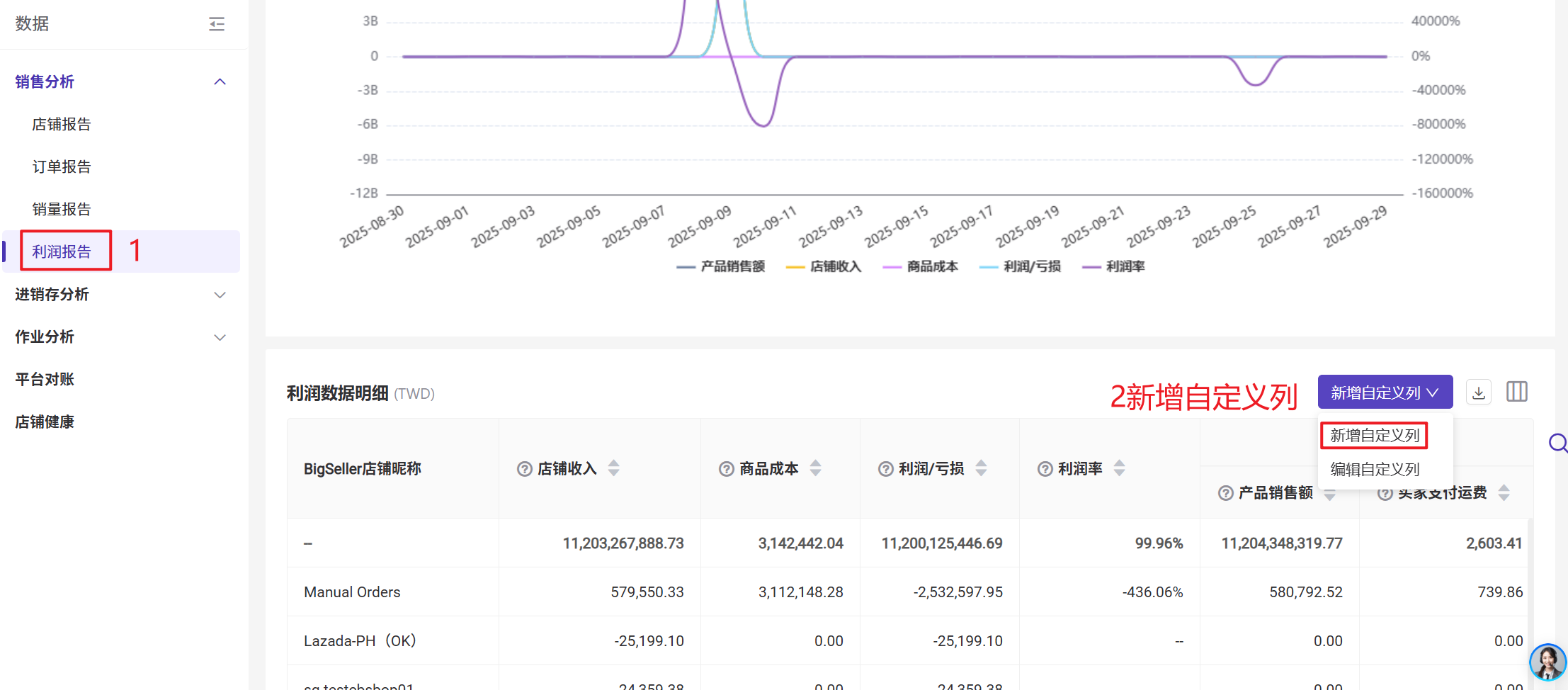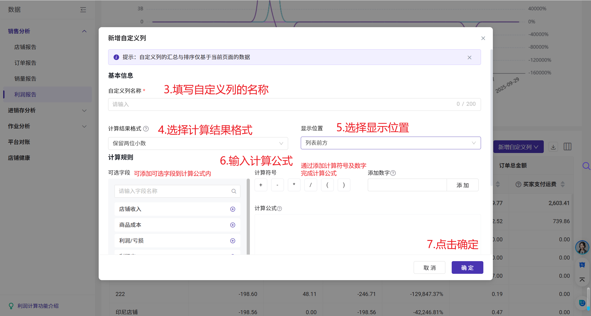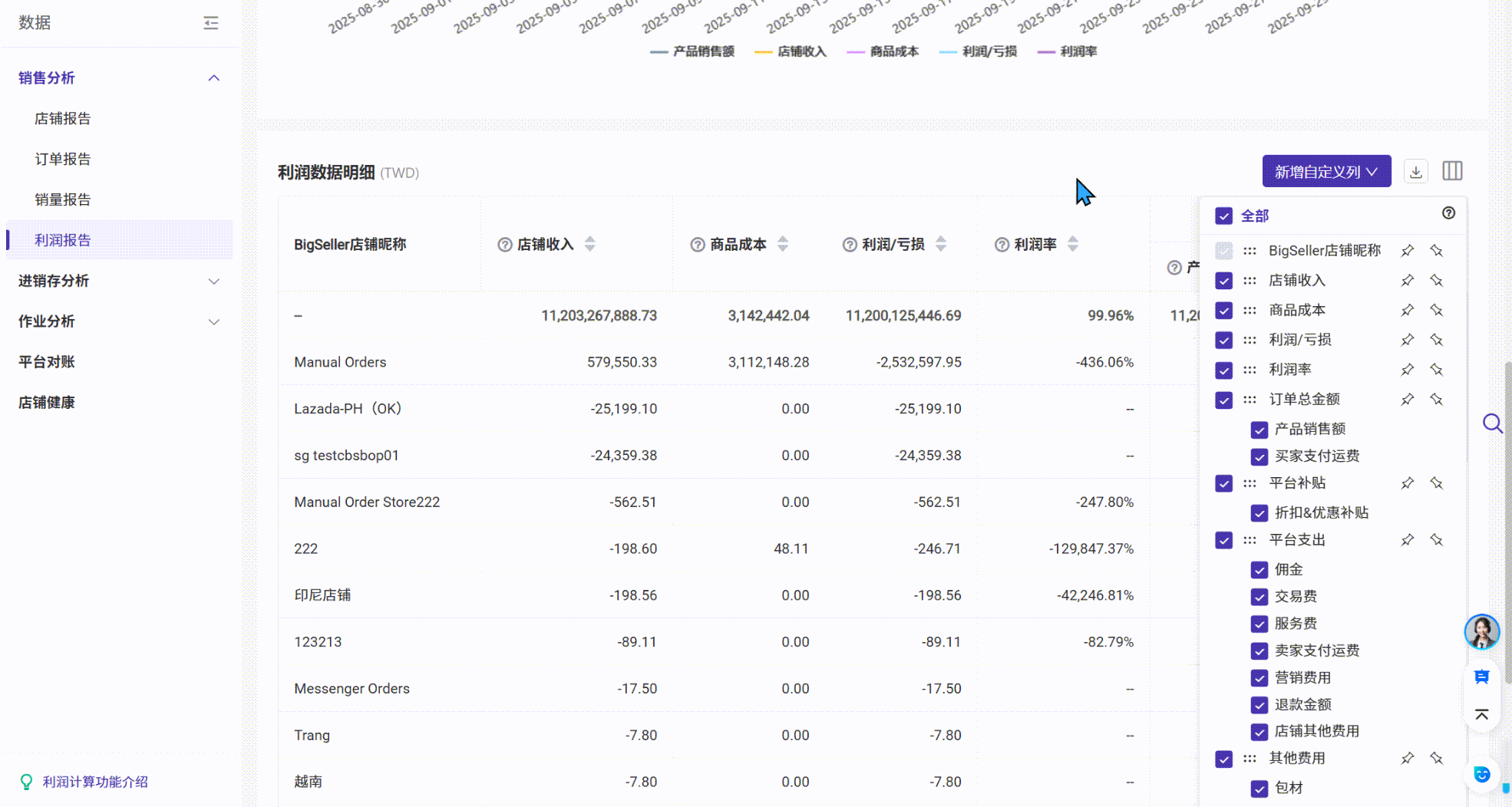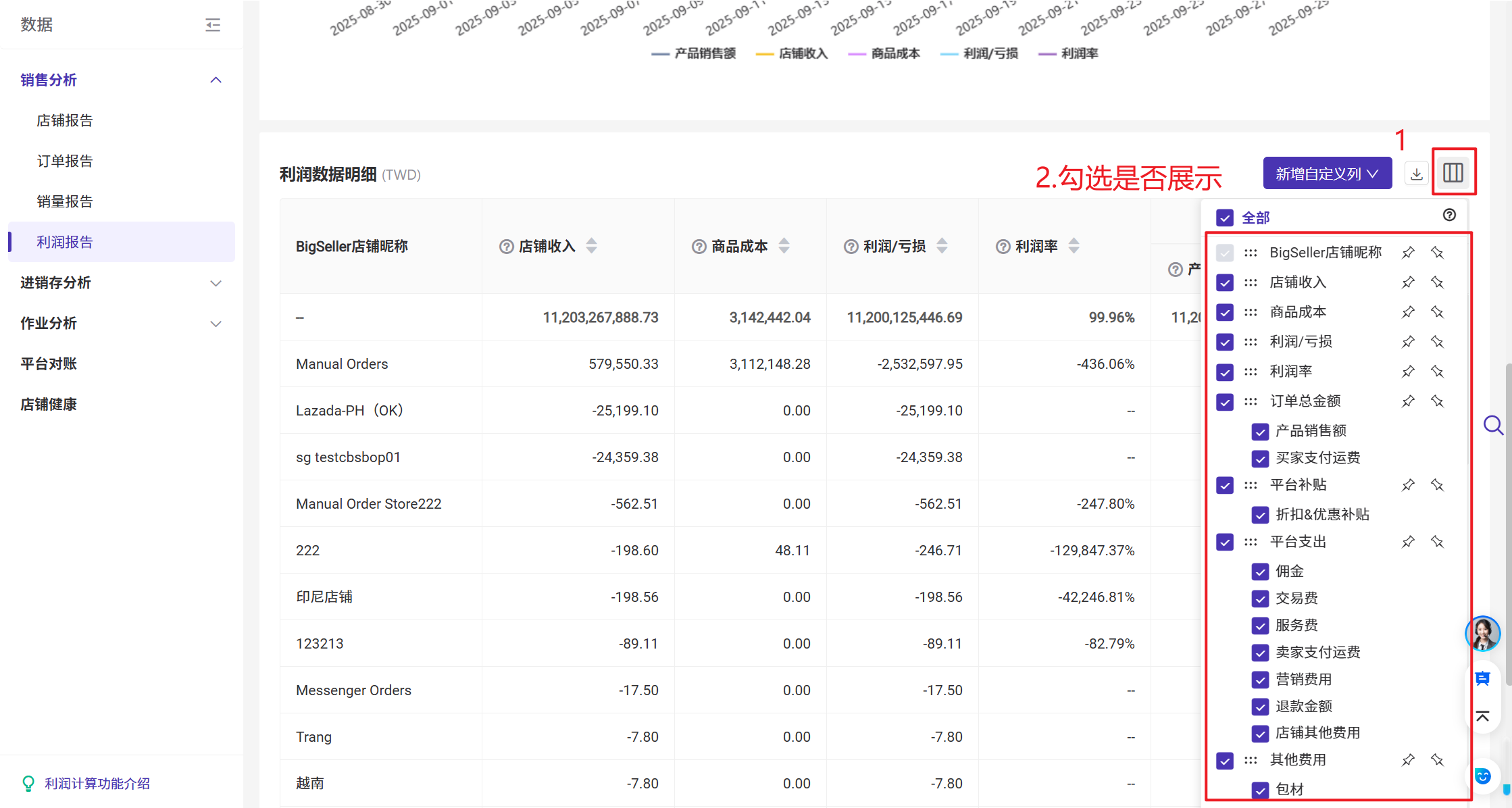 在利润报告页面,可以选择自定义展示数据明细的信息列,不勾选则不展示