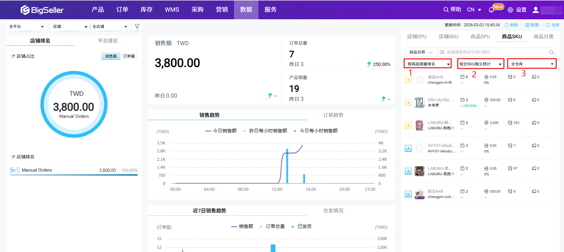 2.目前支持在数据 >热卖商品排行中增加“统计维度”选项,组合SKU独立统计和组合SKU按子SKU统计。方便用户能在系统中能直观的查看单个SKU的销售数据,减少人工统计成本。