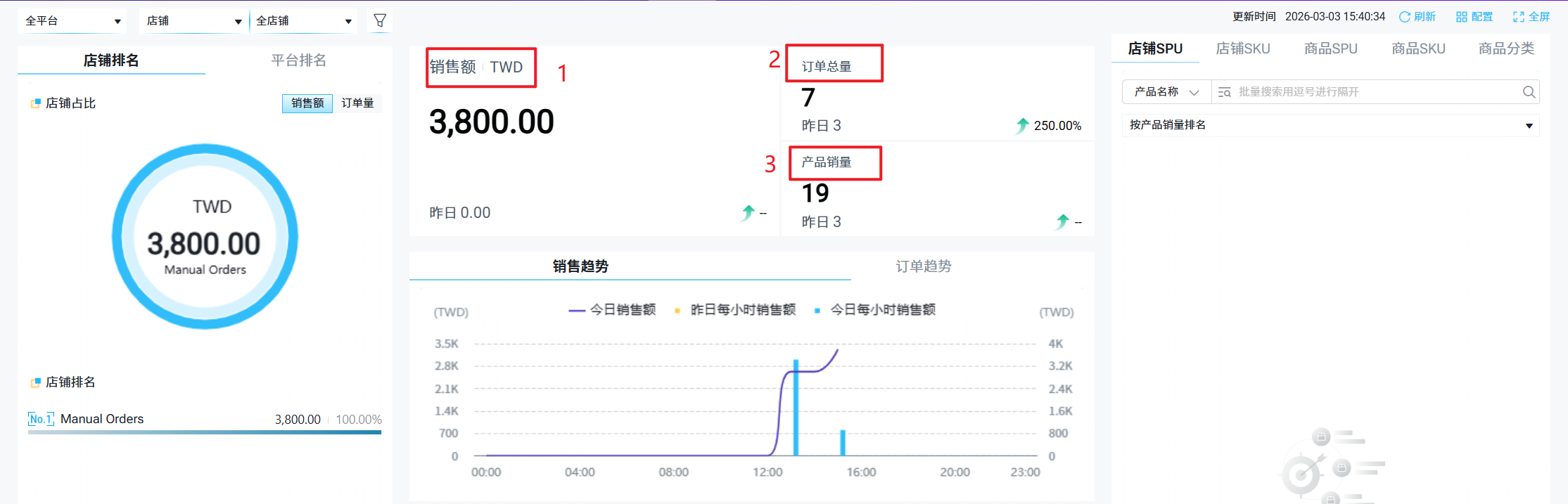 ③ 总销售额:截止更新时间,所选时间内,当前账号下所有店铺的总销售额(不包括取消订单)