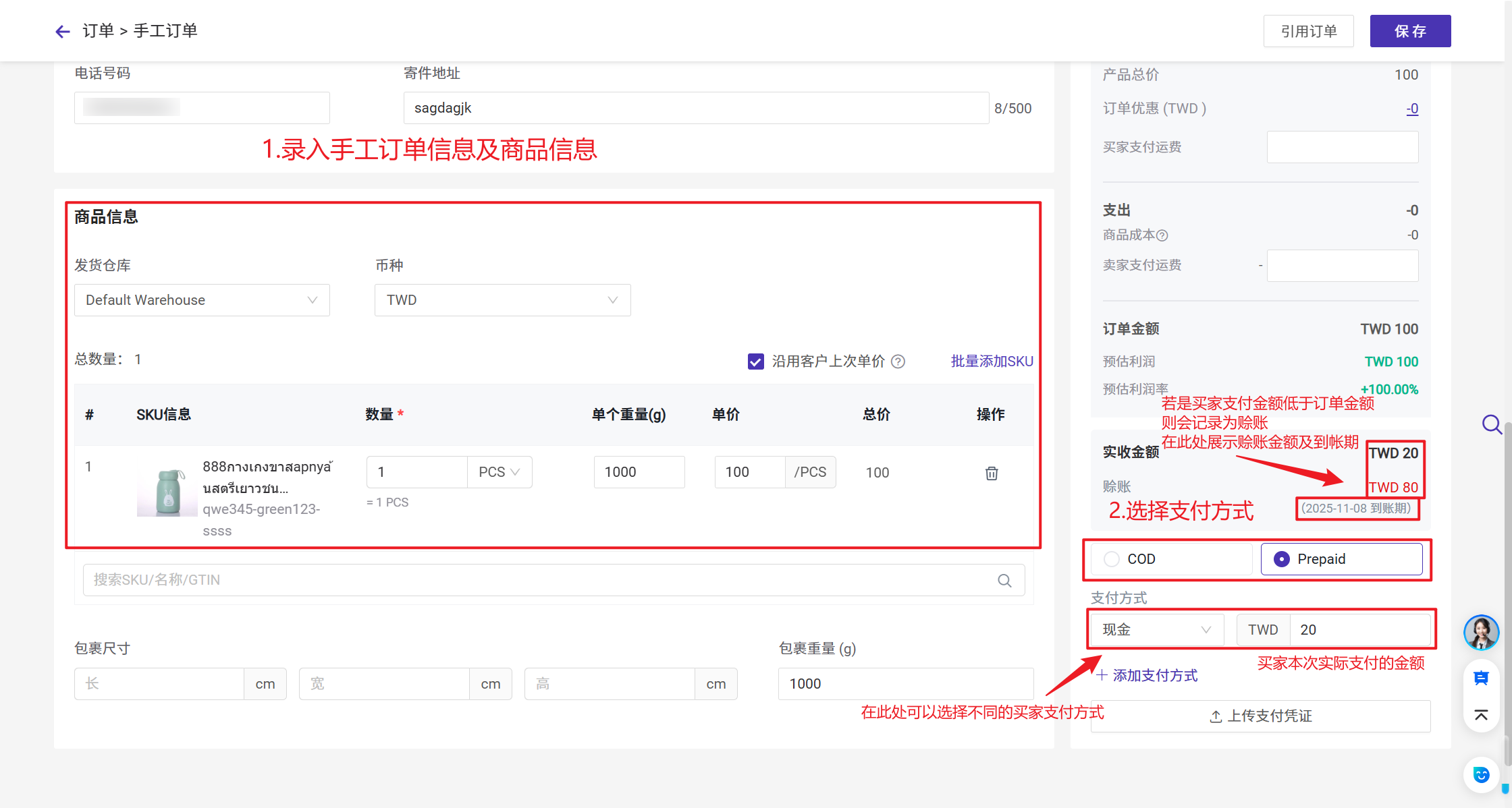 在创建手工订单/聊天订单时,您需要填写客户的支付信息,系统会根据输入内容自动计算本单的实收金额、赊账金额和到账日期。