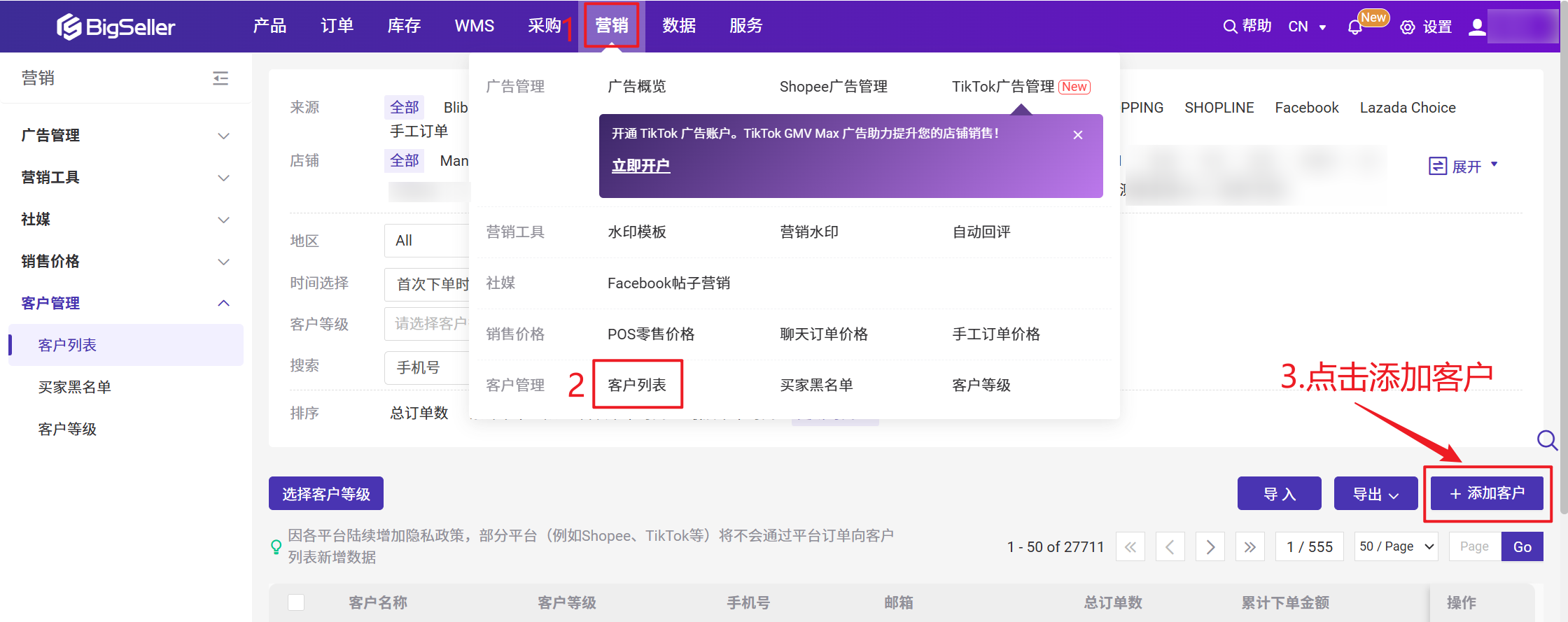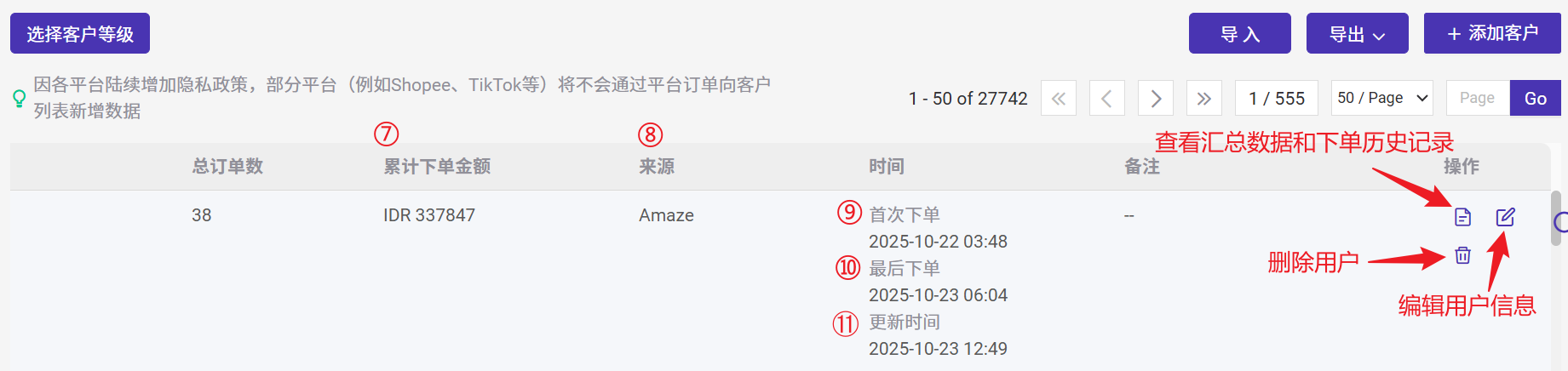 2) 因各平台陆续增加隐私政策,部分平台(例如shoppe、tiktok、tokopedia、lazada)将不会通过平台订单向客户列表新增数据