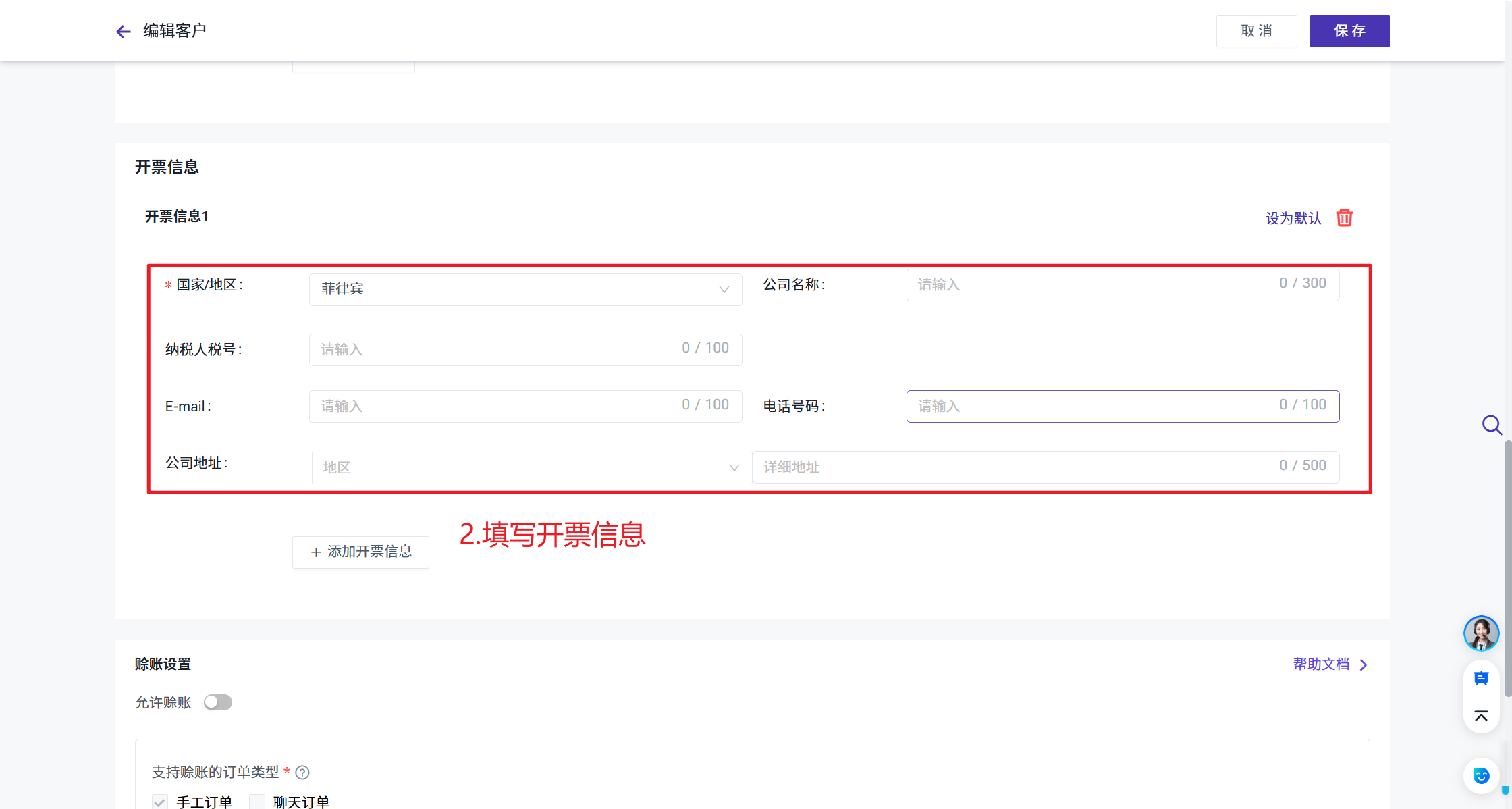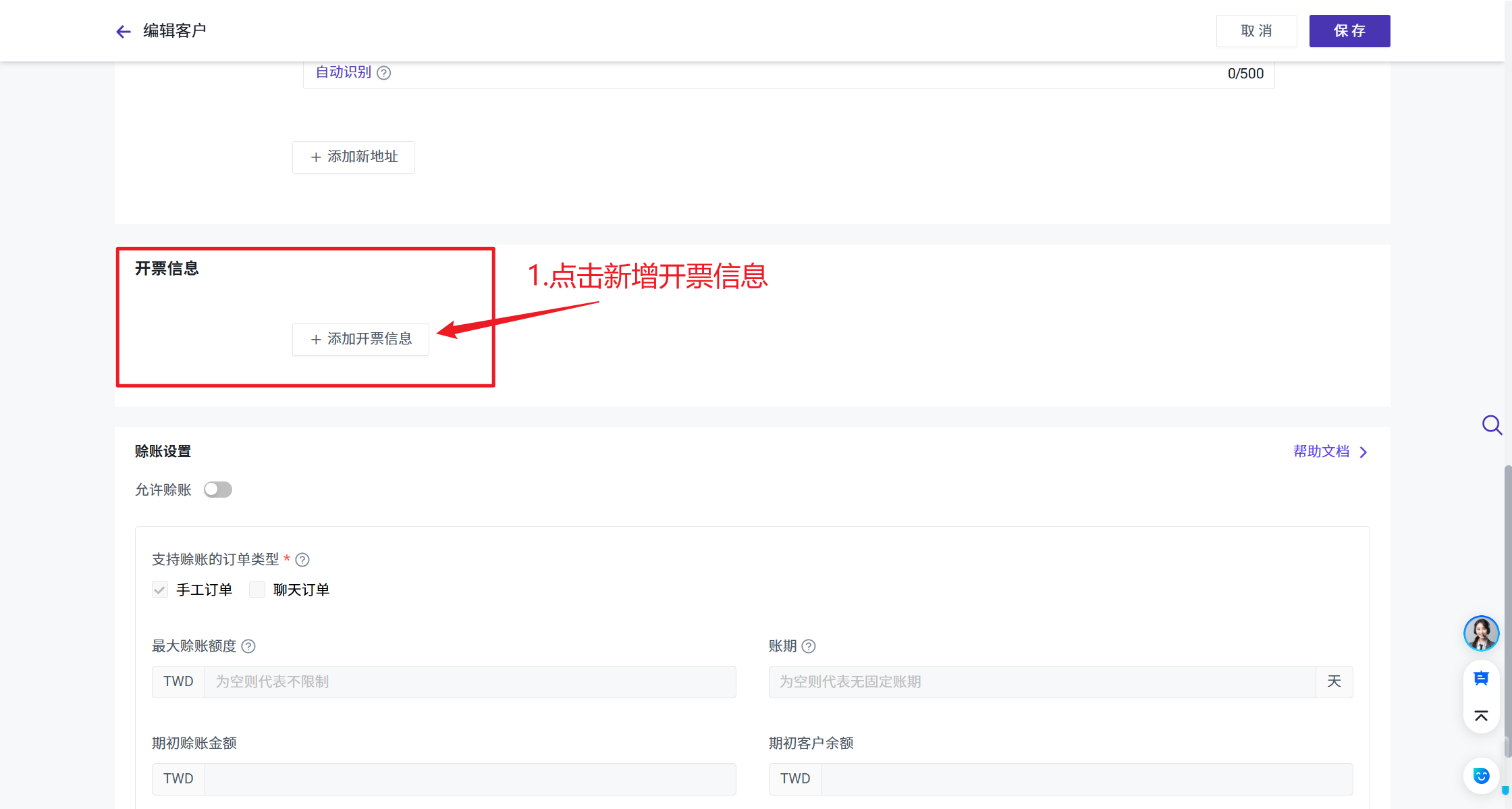 您可以在客户信息页面维护客户开票信息