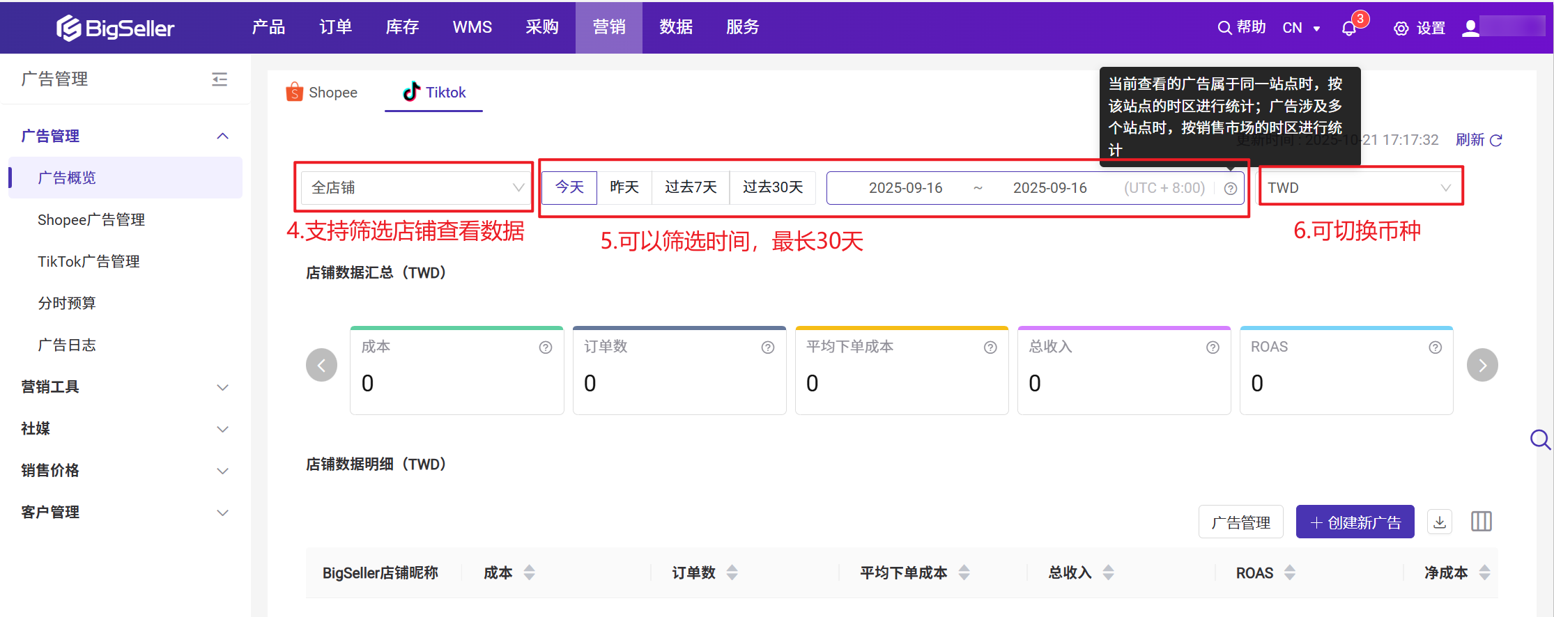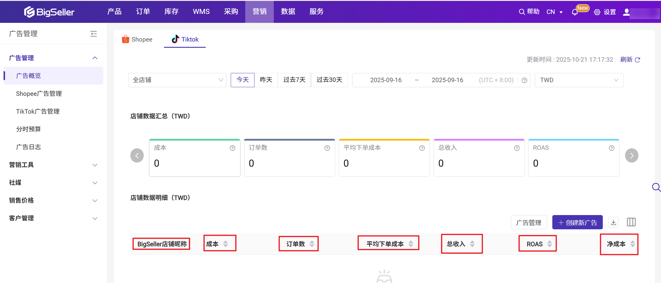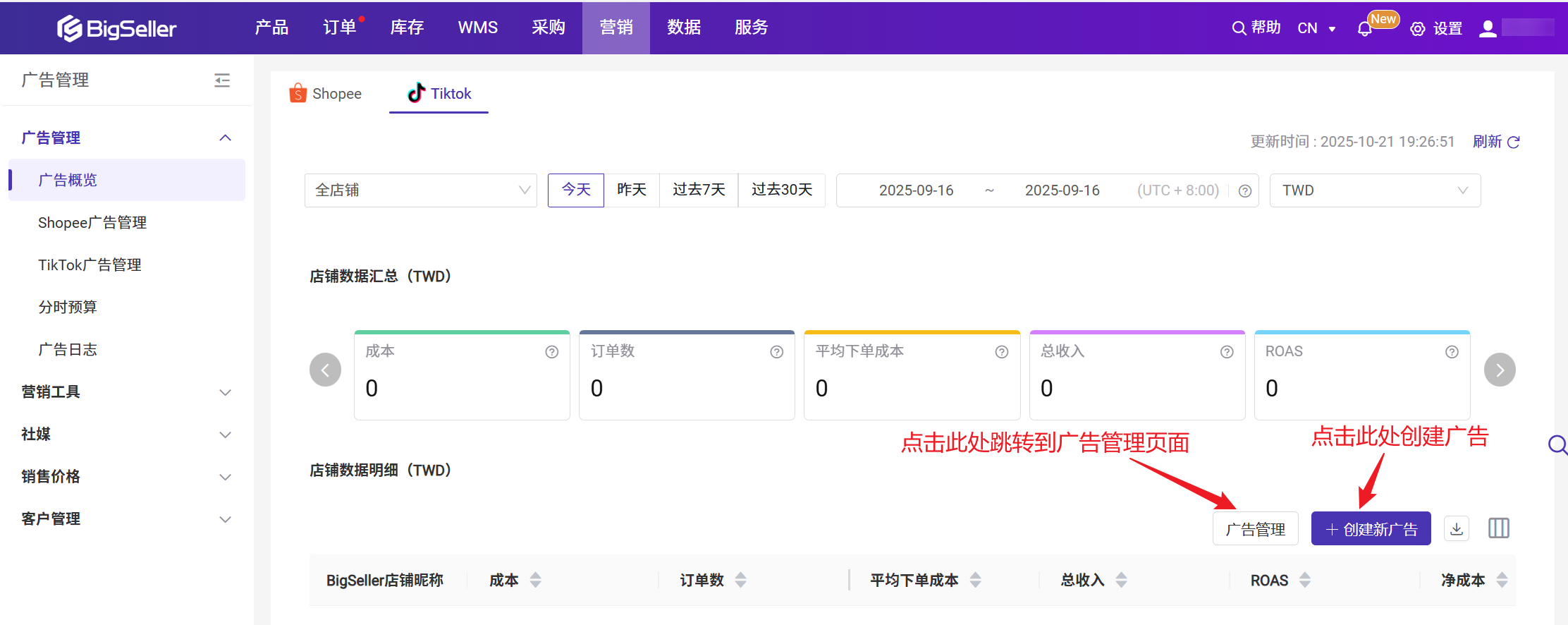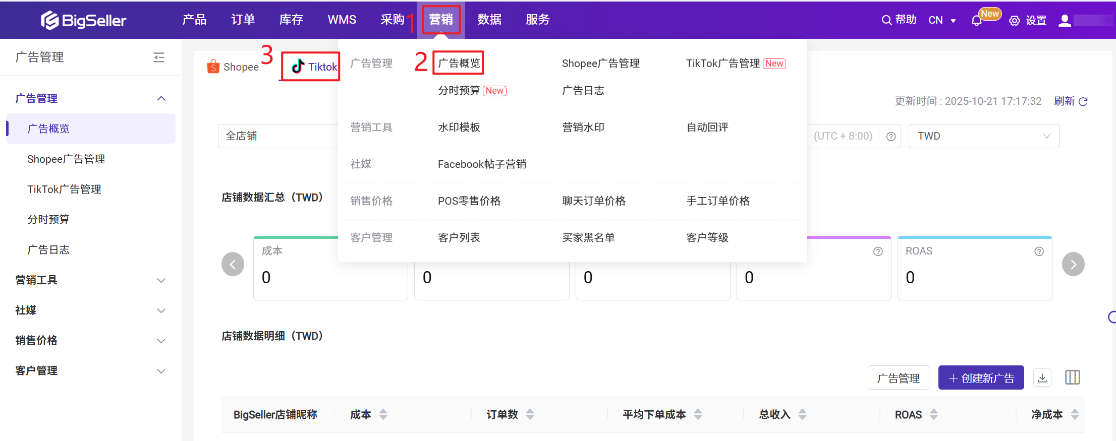 需要授权TikTok广告,才可以在BigSeller查看到对应店铺的广告数据,可以通过广告数据直观查看到通过广告下单的数量。二、操作步骤