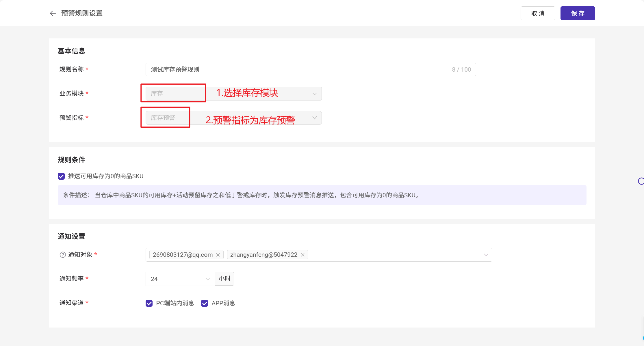 【1】库存预警消息通知,每天早上推送一次;非实时推送。