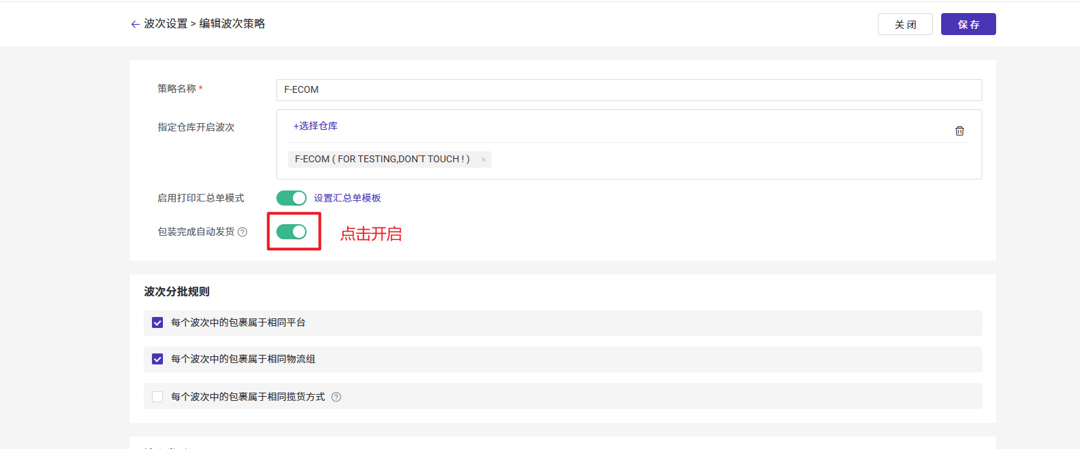 如果您需要扫描包装完之后自动发货,需要在波次策略中设置开启“包装完自动发货”