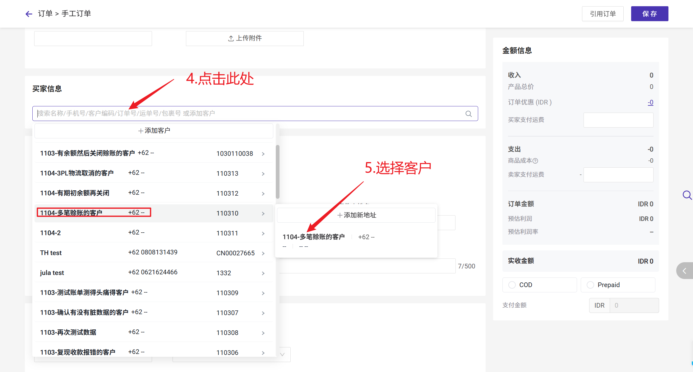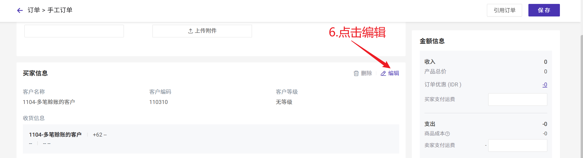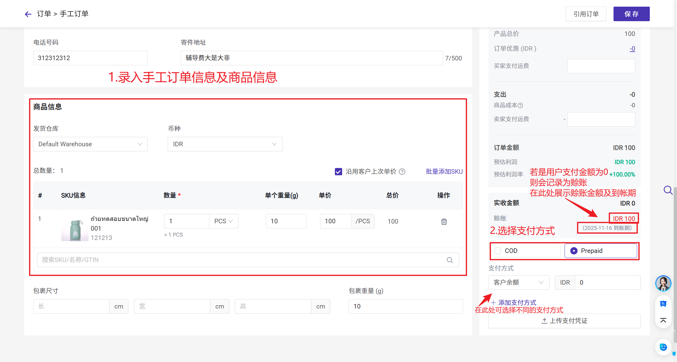 在创建手工订单/聊天订单时,您需要填写客户的支付信息,系统会根据输入内容自动计算本单的实收金额、赊账金额和到账日期。