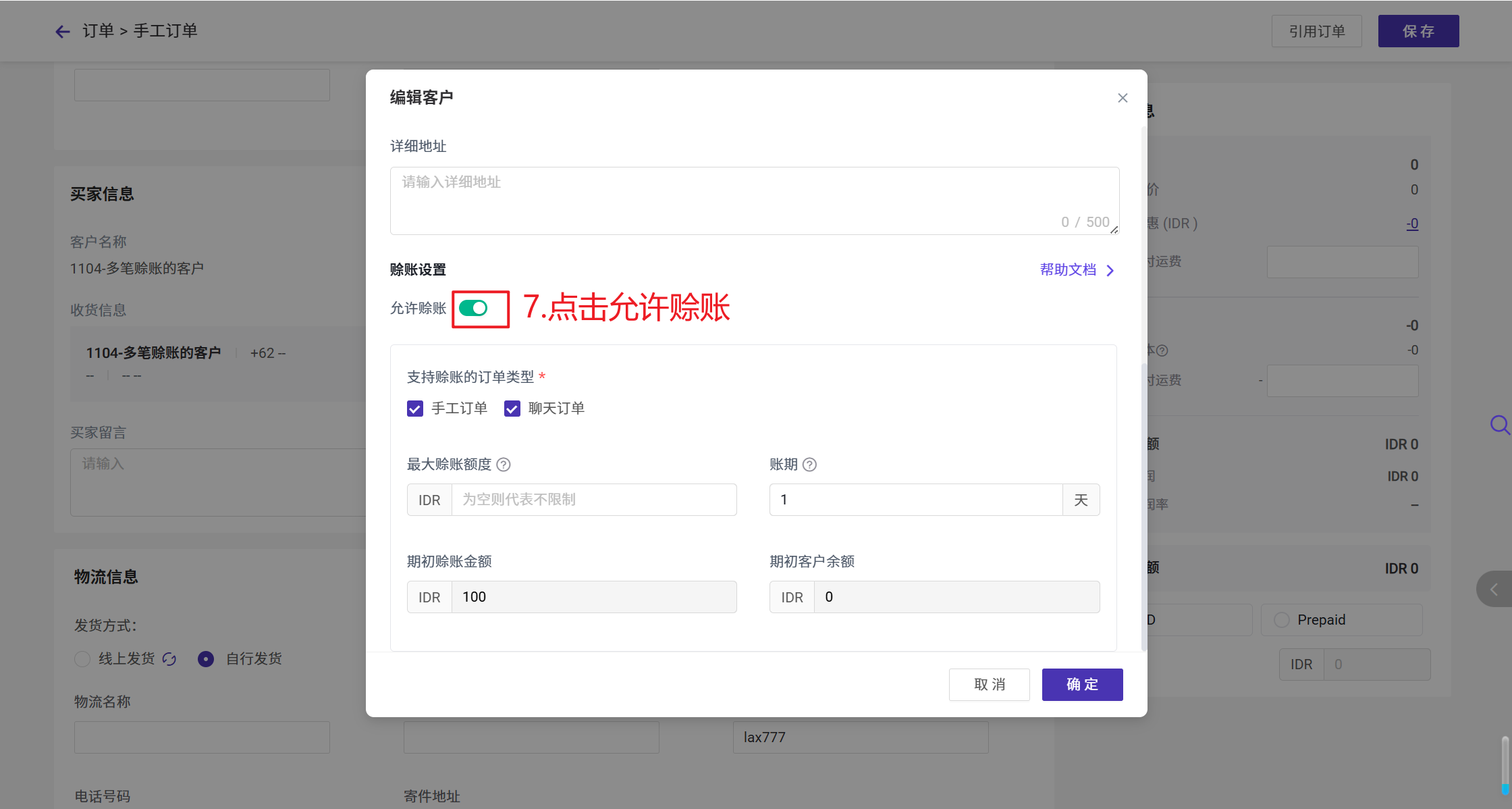 当创建手工订单,聊天订单时,在添加或者编辑客户时可开启赊账功能并进行设置。