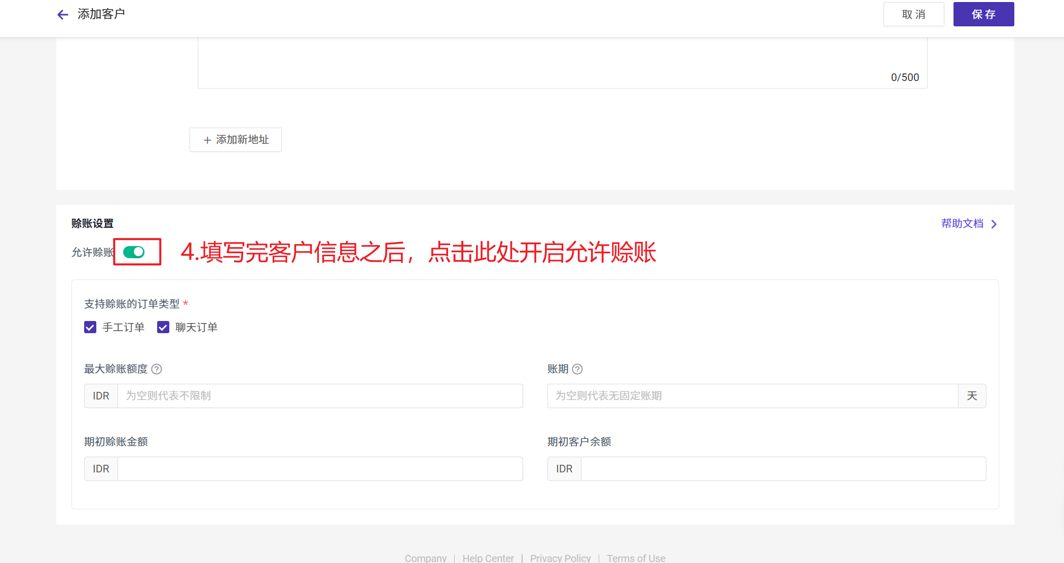在客户列表,新增/编辑原有客户时,可以开启赊账功能