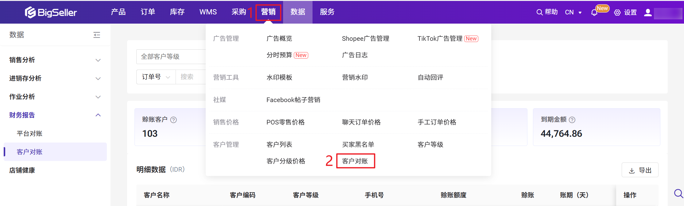 第一步:营销 > 客户管理-客户对账或者数据 > 财务报告-客户对账