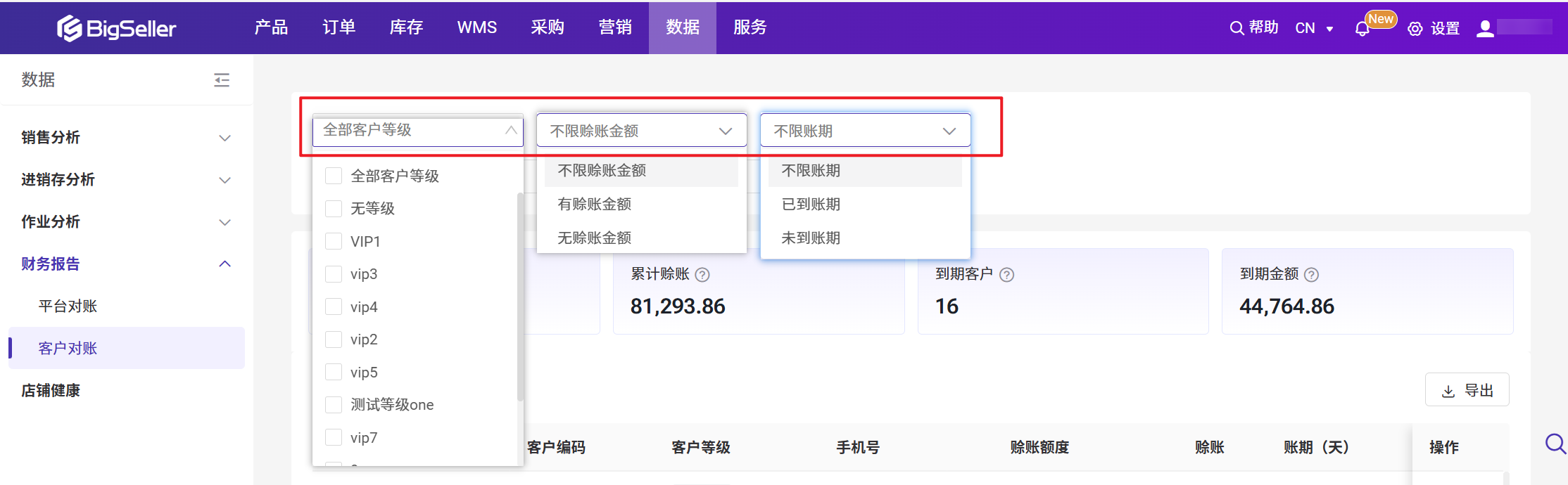 • 不限账期:全部客户,账期已到和账期未到的客户