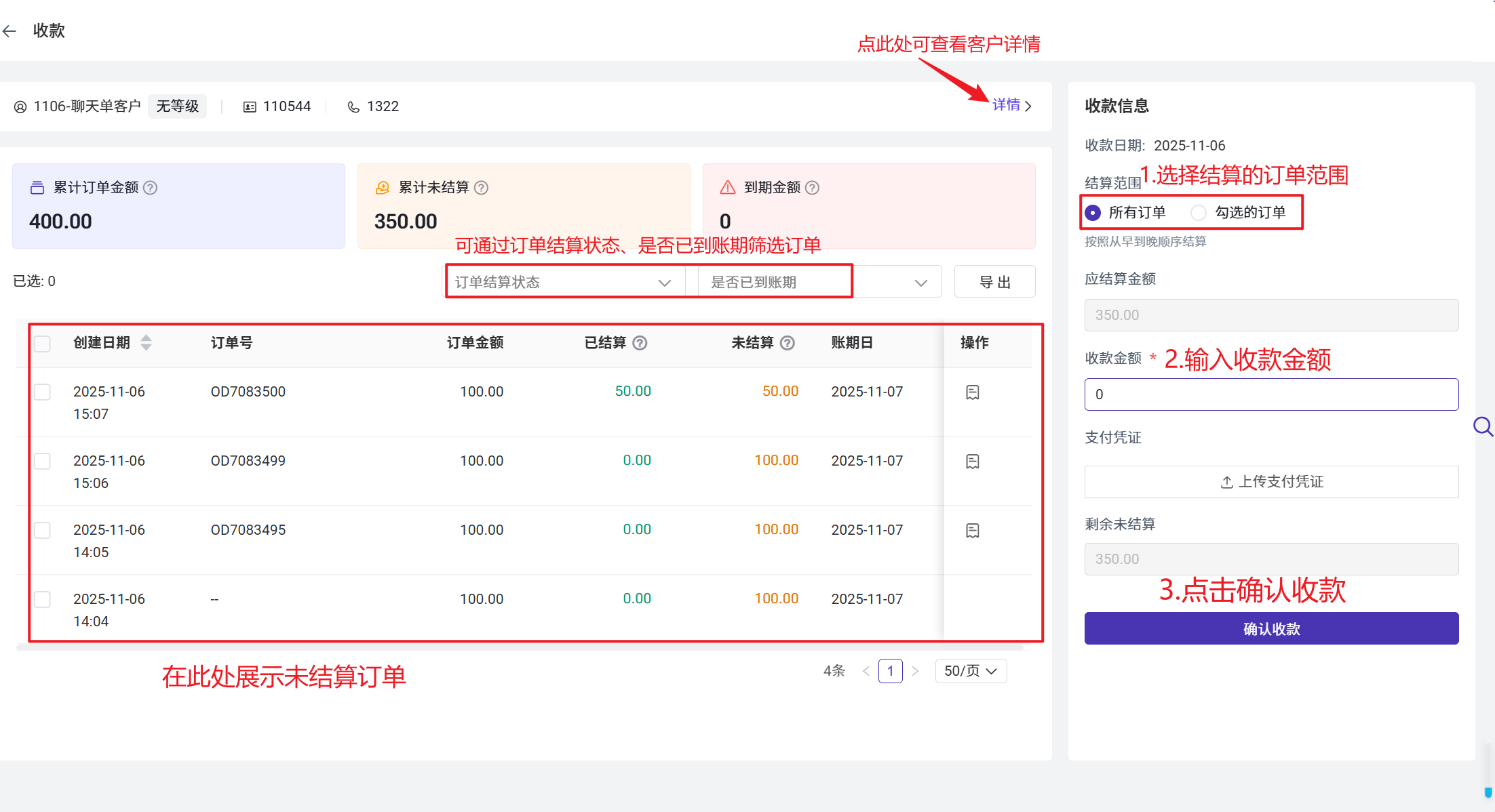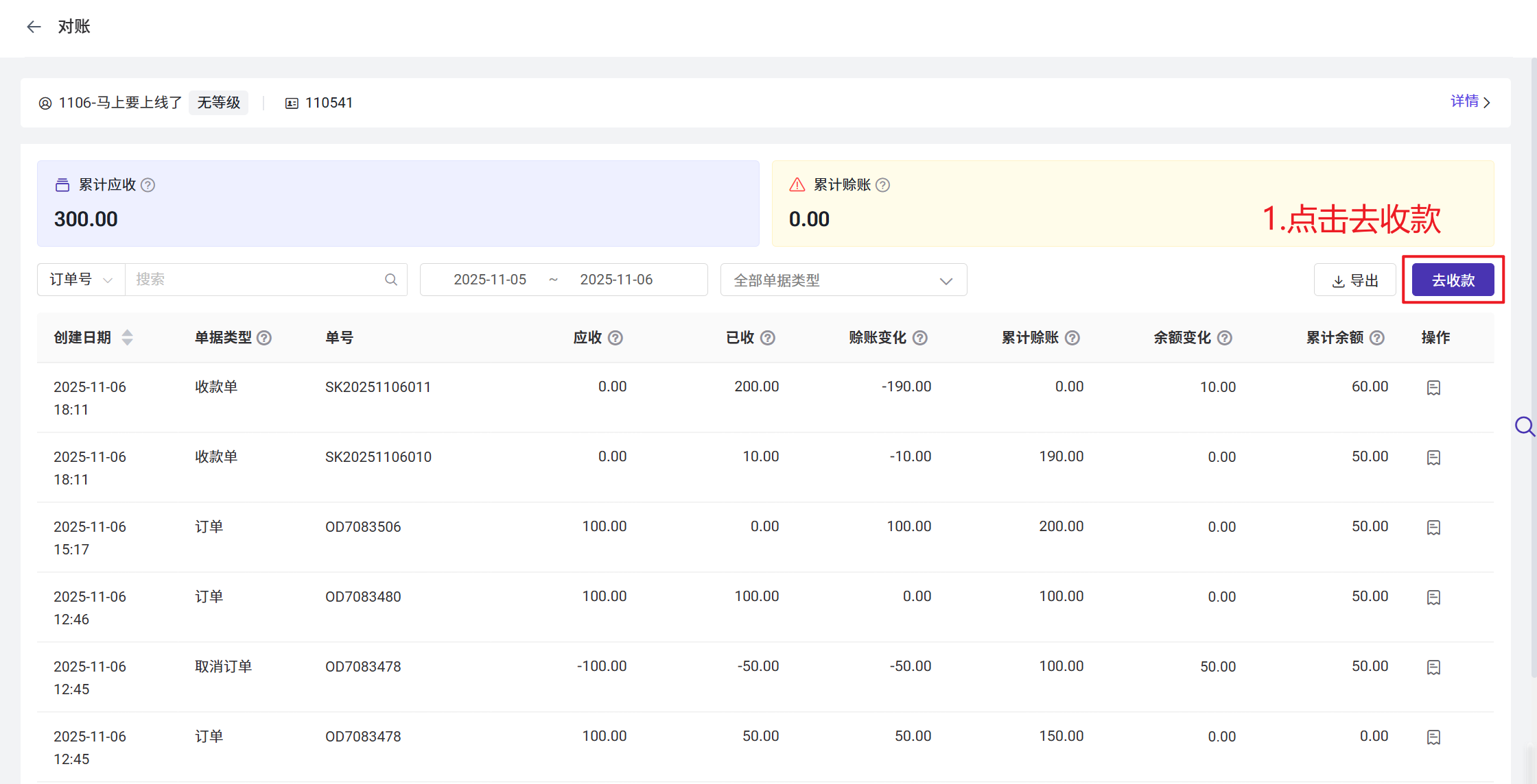 订单创建完成后,可在【客户对账】中查看该订单的赊账记录与收款情