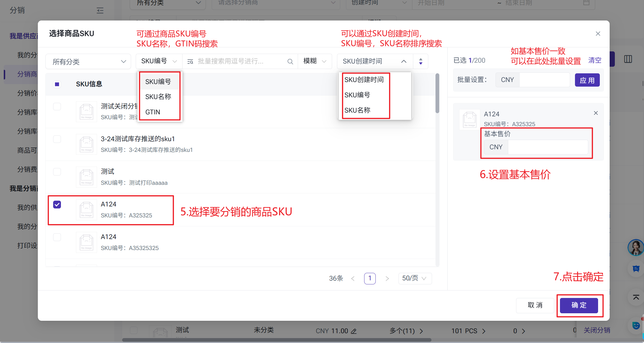 可批量选择现有的商品SKU,开启分销状态