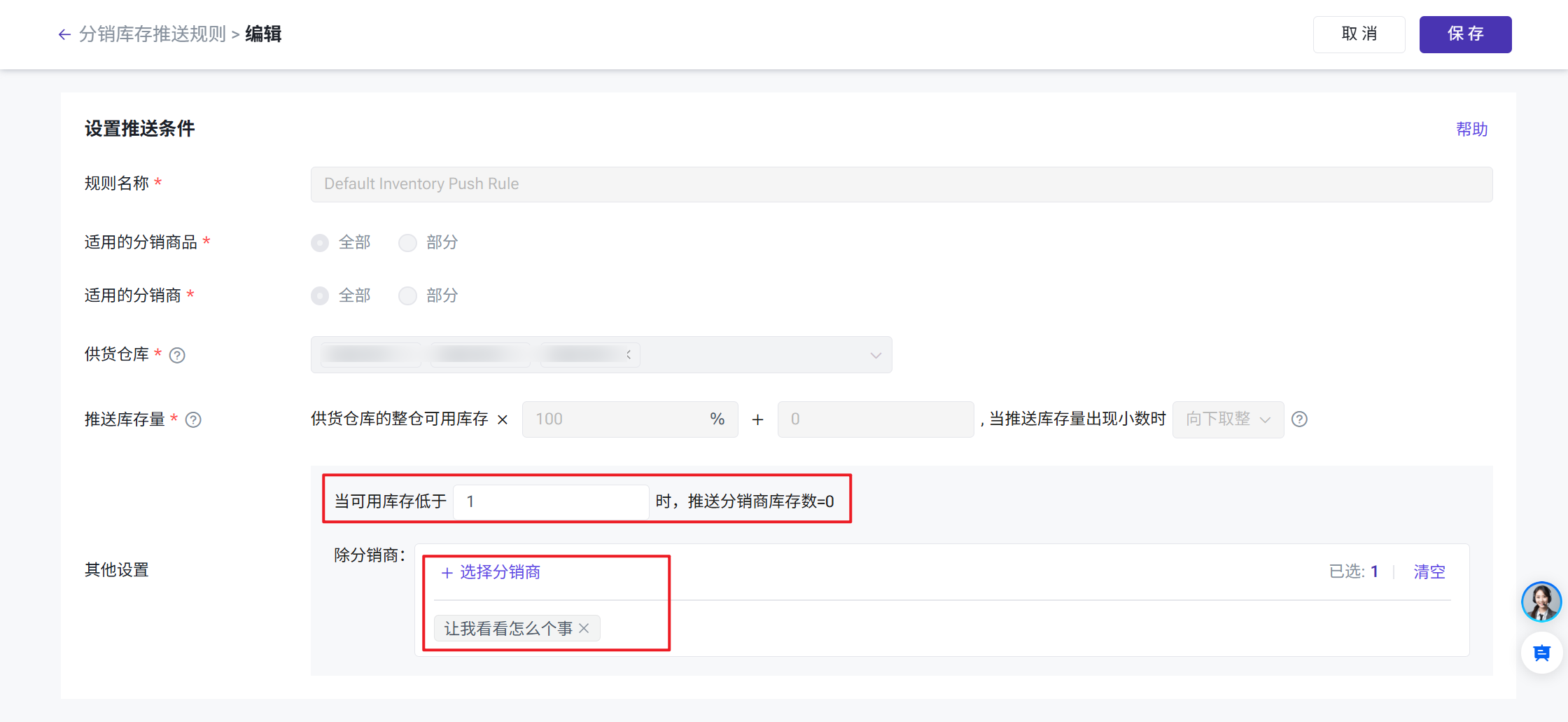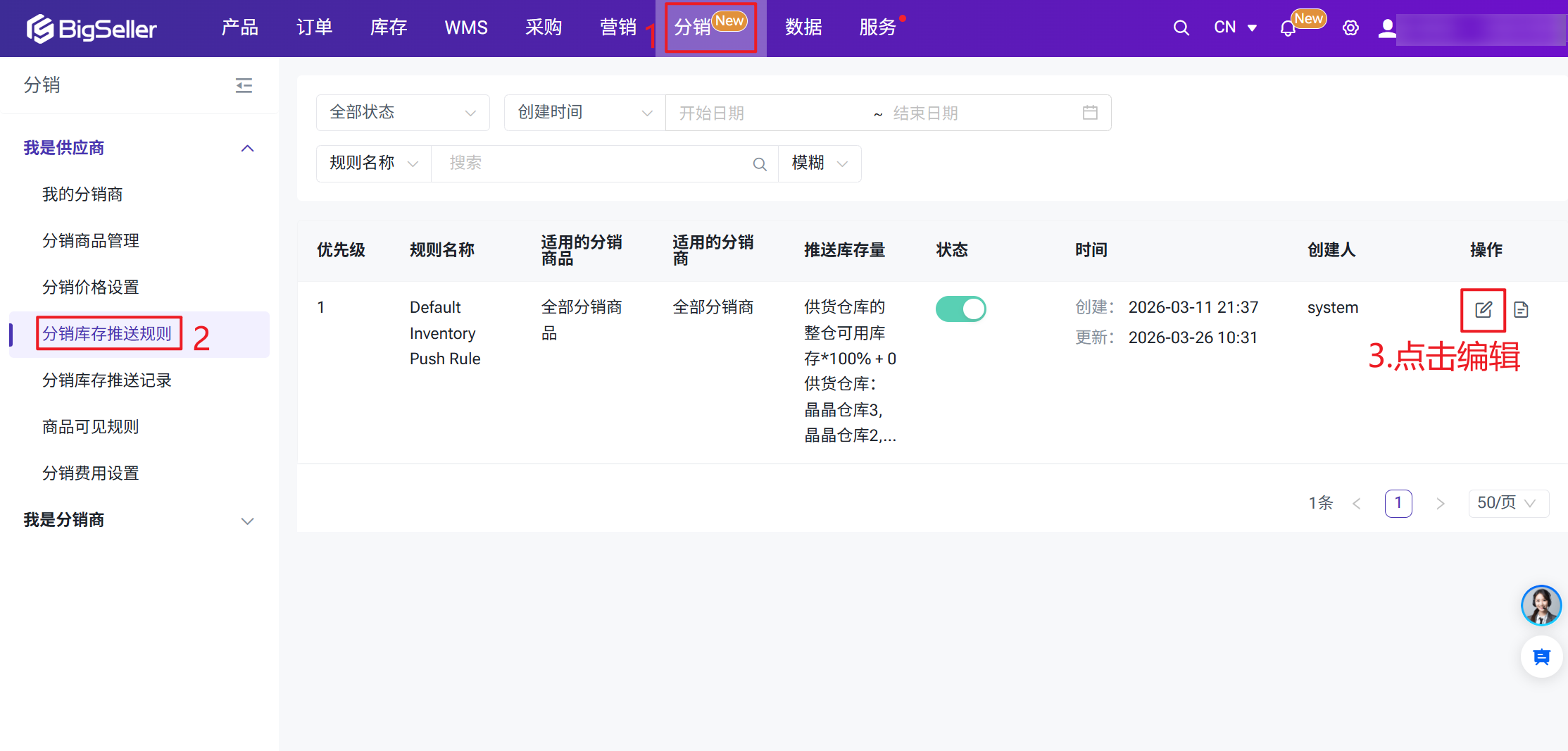 供应商通过新增分销库存推送规则控制分配给分销商的分销库存。系统初始化预设1条分销库存推送规则,默认应用于全部分销商品、全部分销商,按支持分销仓库的可用库存一一对应分销商的供应商仓库进行推送。(目前仅支持设置全量推送库存)进入分销 > 分销库存推送规则 > 点击编辑