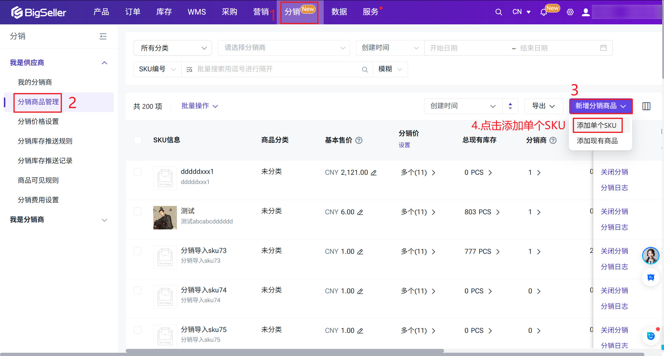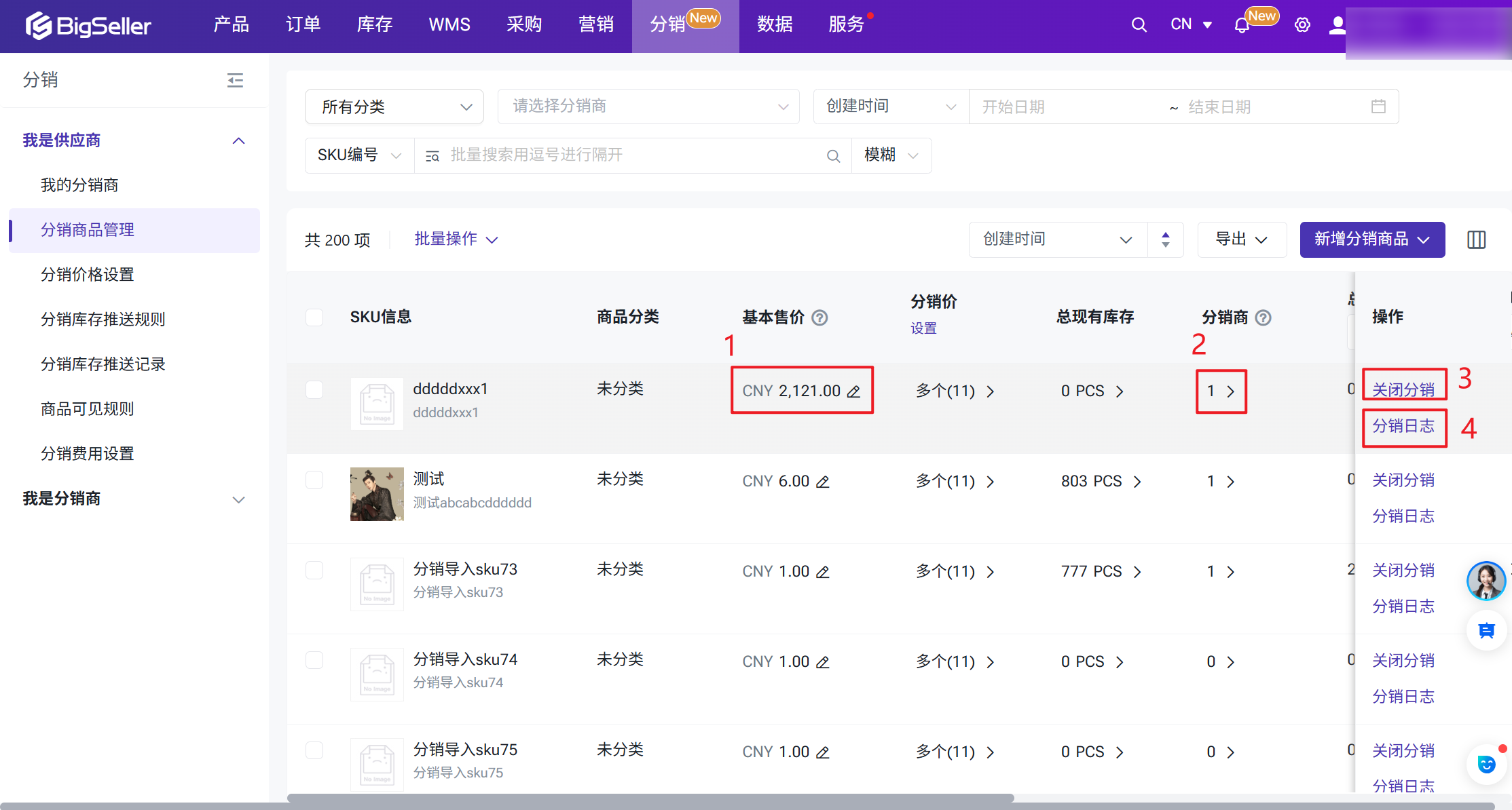 分销商品管理页面,最多可添加200个分销商品,不支持添加组合SKU为分销商品