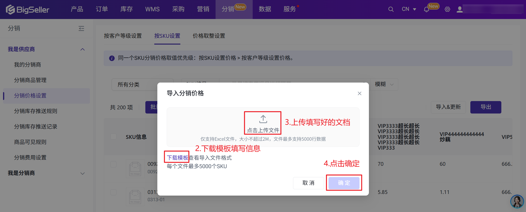 | 导入&更新 | 支持按模板批量导入SKU级别的分销价,适合品类多、SKU 数量大的场景 | 使用系统导入模板每个文件最多5000个SKU |