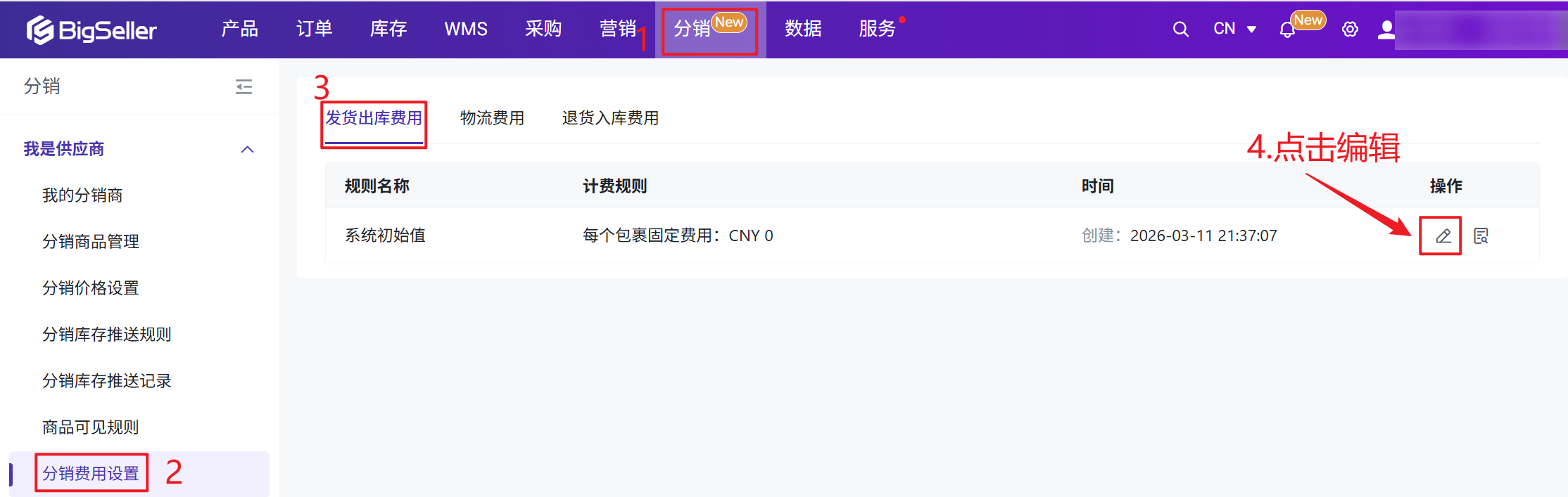 分销费用在分销商推单时自动计算并记入对账流水,分为正向订单费用和售后订单费用两类。发货出库、物流、退货入库都可以设置按照包裹或者包裹内的SKU设置费用