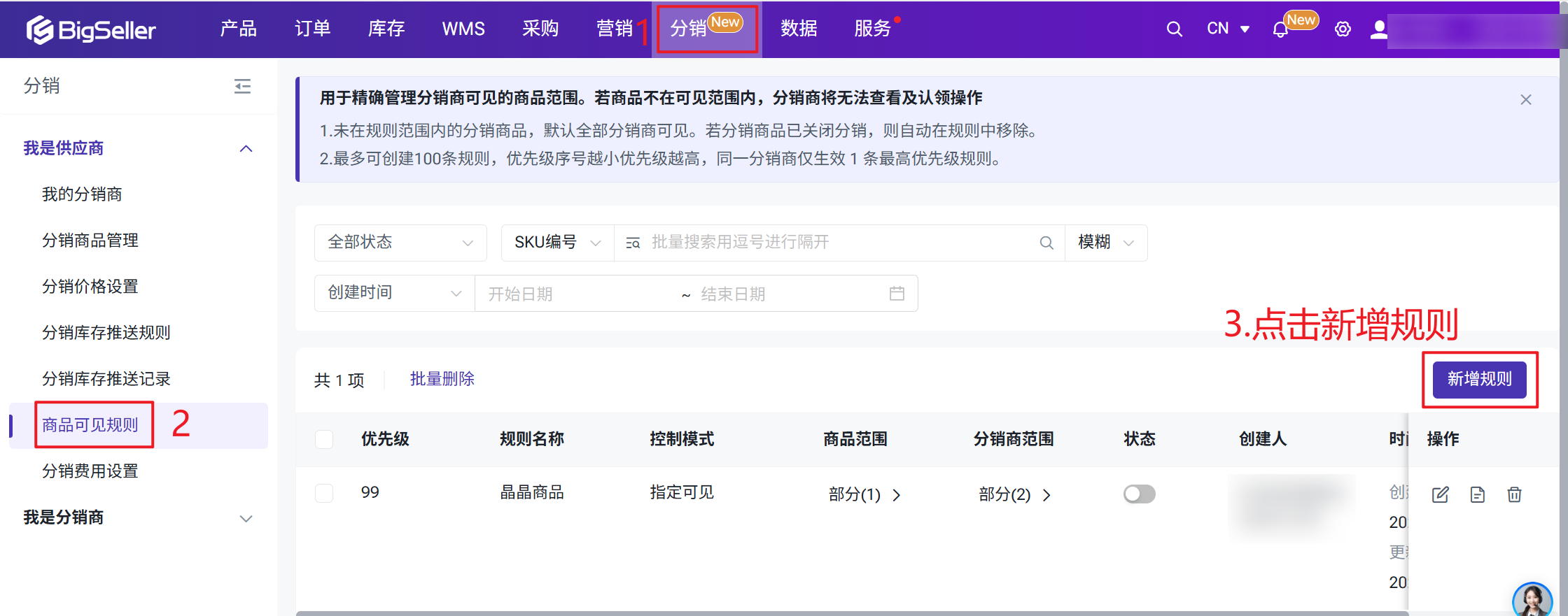 2、最多可创建100条规则,优先级序号越小优先级越高,同一分销商,仅生效1条优先级最高的规则