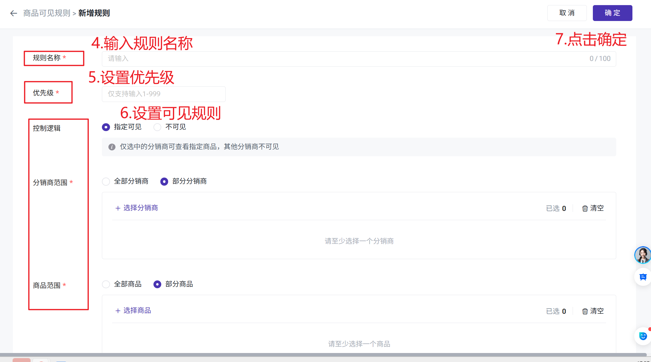 1、未在规则范围内的分销商品,默认全部分销商可见。若分销商品已关闭分销,则自动在规则中移除。