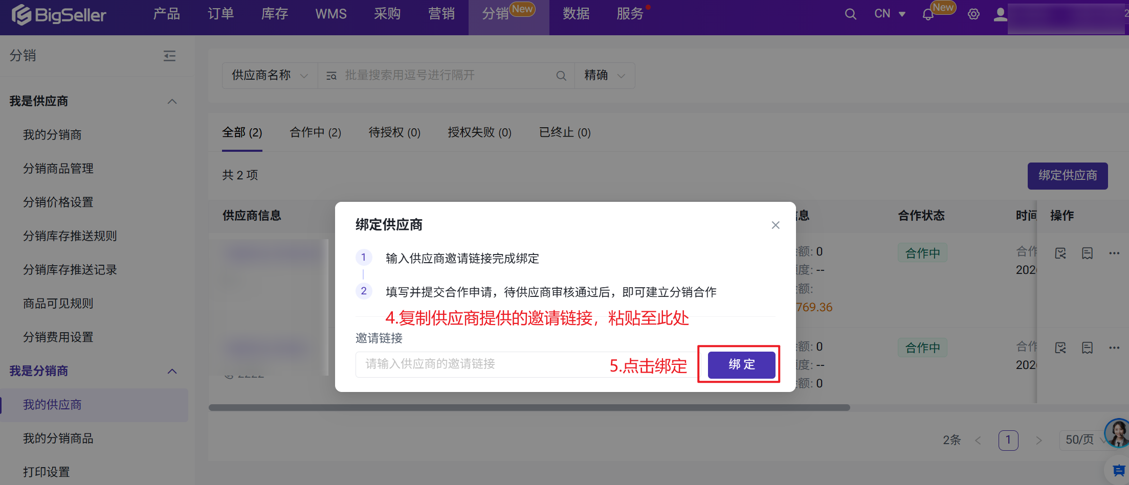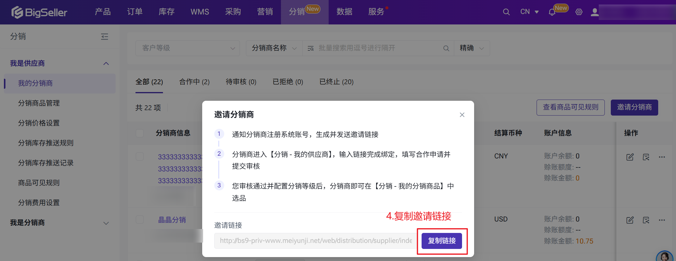 第二步:复制邀请链接 > 发送给分销商 > 分销商进入我的供应商页面填写邀请链接申请